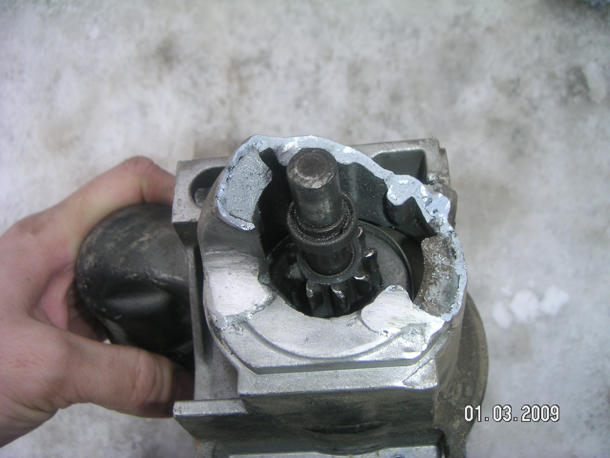Вообщем, случилось следующее. Пол дня прокатался, все было отлично. приехал домой, поставил, час спустя выхожу, начинаю заводить, а он сопли еле еле жует и нихрена вразумительного сказать не может. Я подумал, акум сел.(хотя с чего там пещалок немеренно оставить что то включенным не реально) думаю прикурю, а он опять тоже самое. Ну, думаю привет стартеру. залез под него скрутил стартер, кстати отлично придумано: болты крепления поперек, а не в доль, снимаю и что вижу. Долбанный силумин :evil: , отлив передней части где происходит зацепление, отвалился, ось болтается с шестерней сама по себе, клинит в перекосе и от того еле еле крутит.