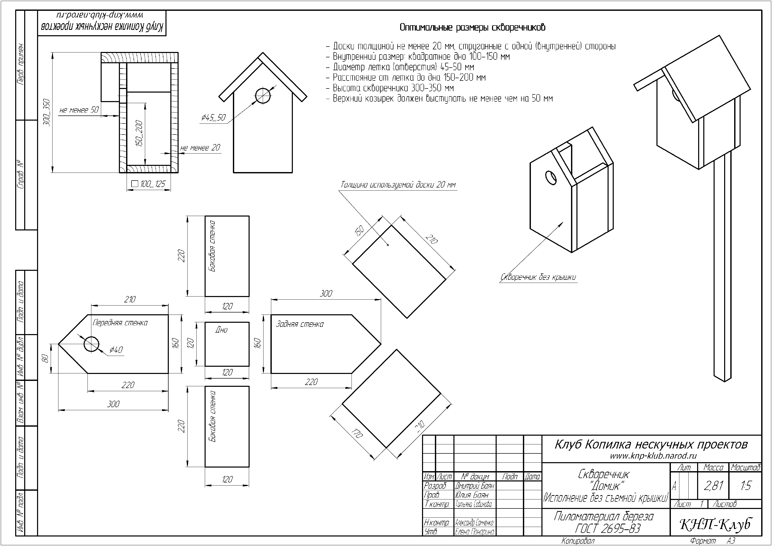 Чертеж из сети прилагаю, может кто заинтересуется. На днях сооружу еще несколько - повешу в парке у реки, школьники в последние годы перестали этим заниматься как раньше. Свои еще думаю покрыть тёмным антисептиком и мягкой кровлей под черепицу для пущей долговечности.