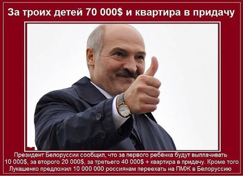 10 млн человек, а не денег, Лукашенко приглашает на пмж.SUPER писал(а):Ой, это за рождение троих детей- я не готов. А 10 милионов это сколько в рублях?