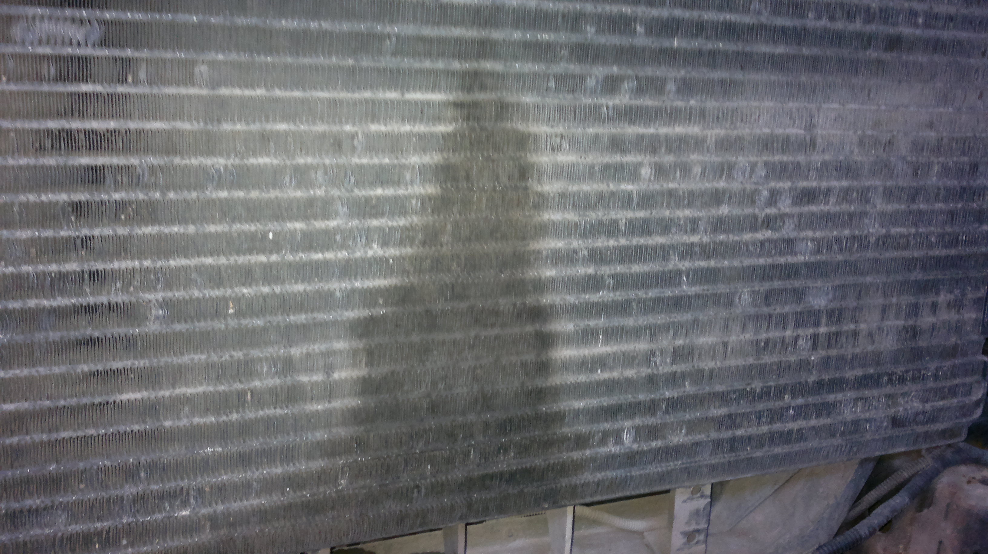 Что за пятно по центру радиатора кондиционера такое? И тер и нюхал, понять не могу. Пробит радиатор?
