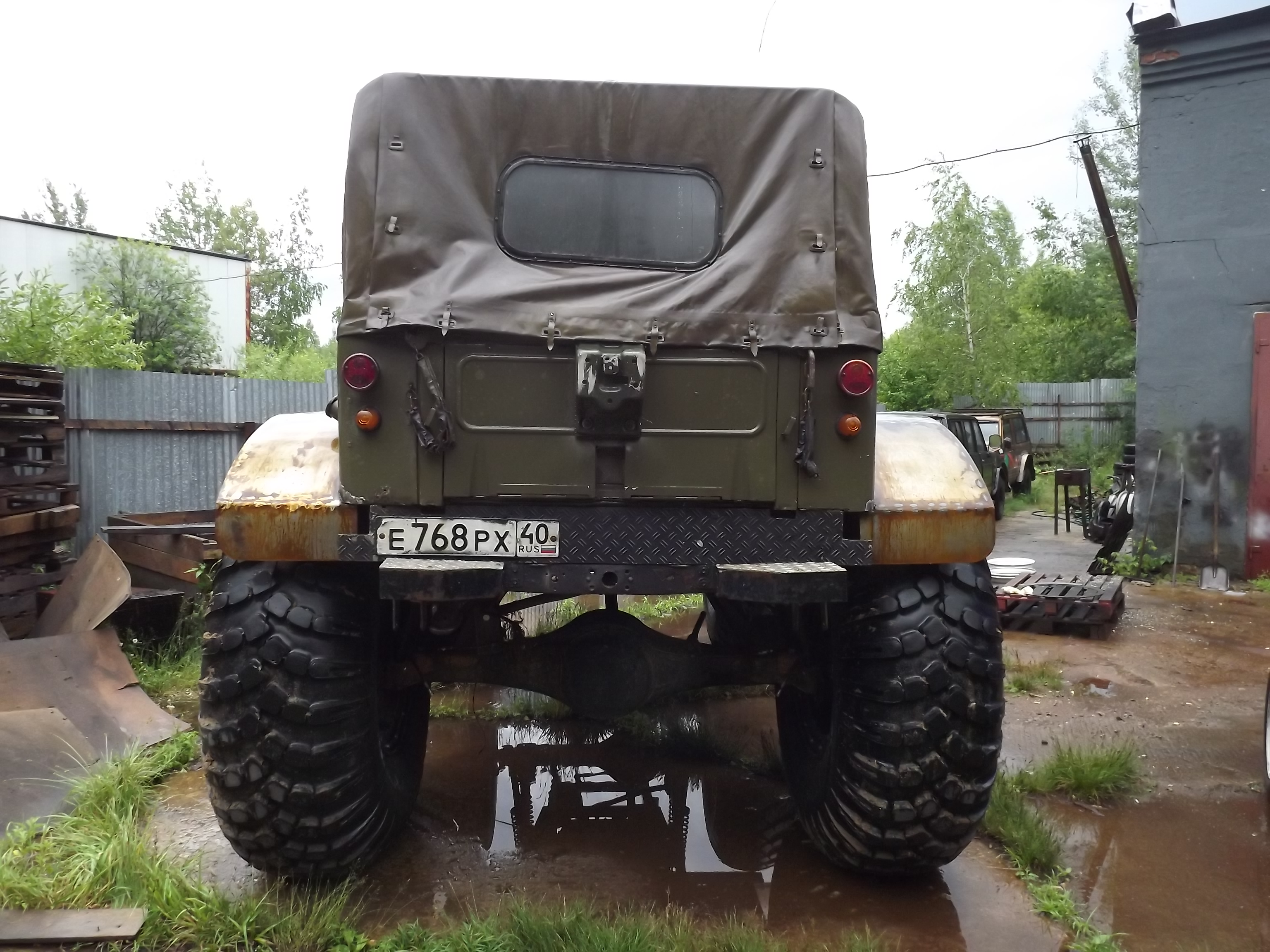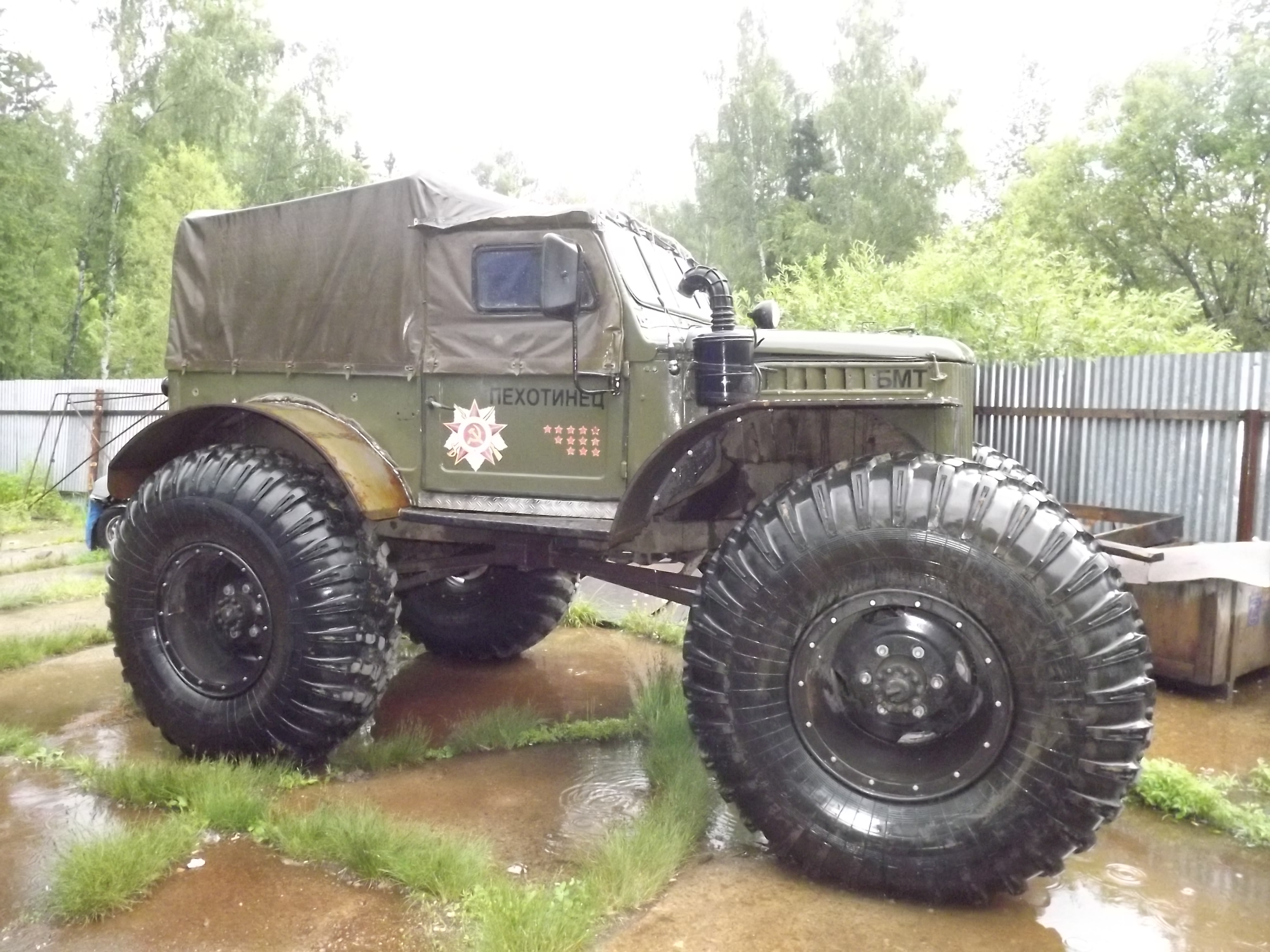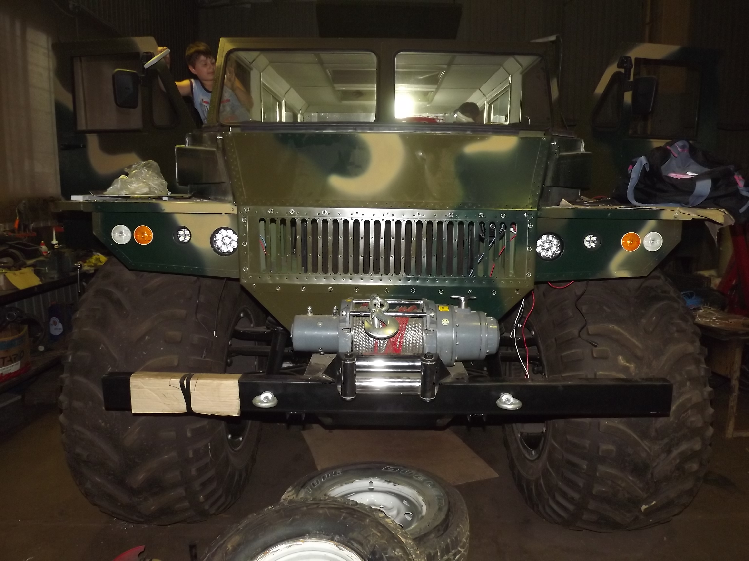 У которого пока не имени, не марки и не модели нет! Он просто дитье моих ребят. Сами сконструировали! И это дитье с высокой проходимостью, с 3-я мостами, с шинами пониженного давления, с регулируемыми аммортами, и плавником!!! Это чуда будет еще и плавать! Корпус из люмий, поднимали на раму хайджеком.