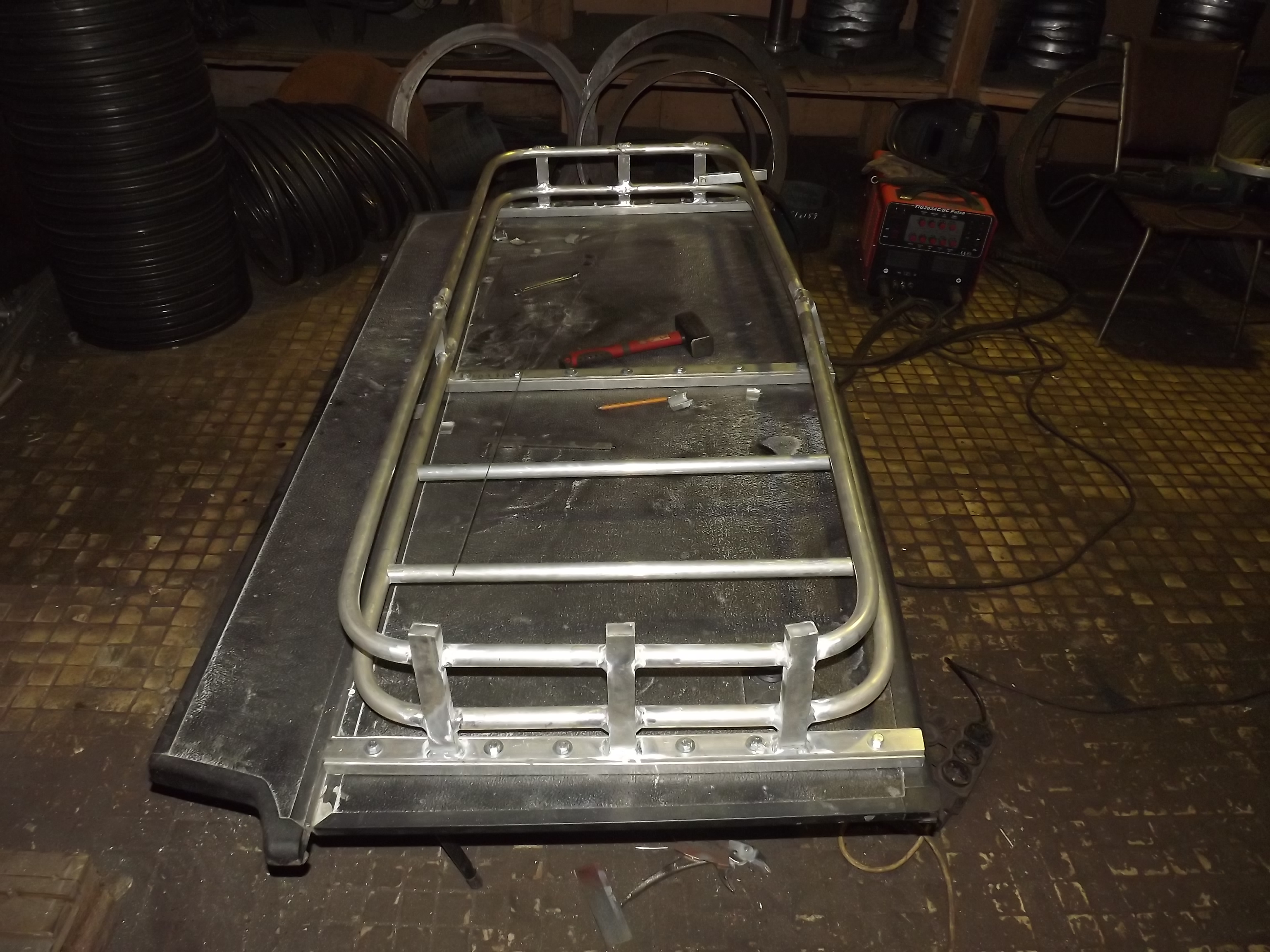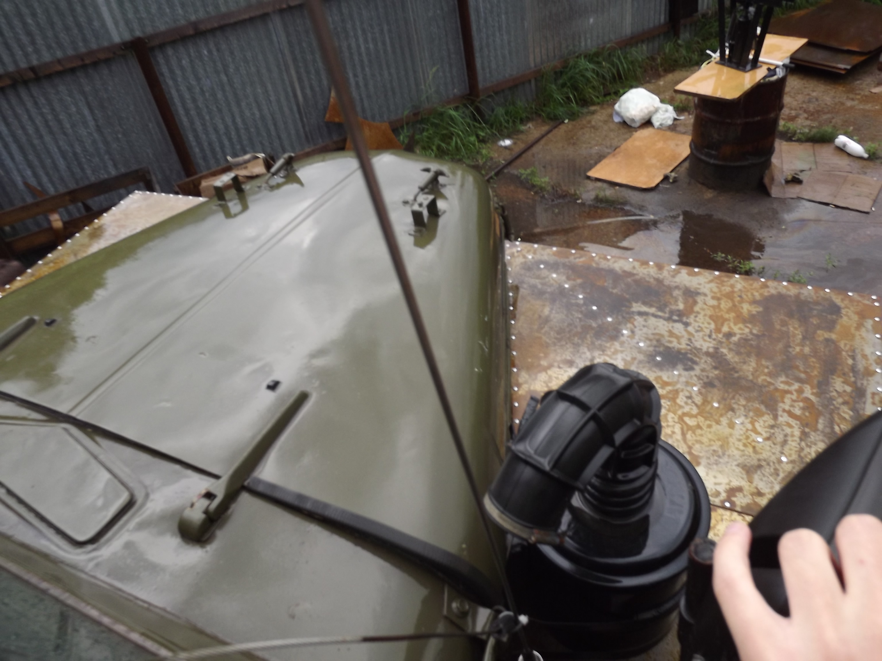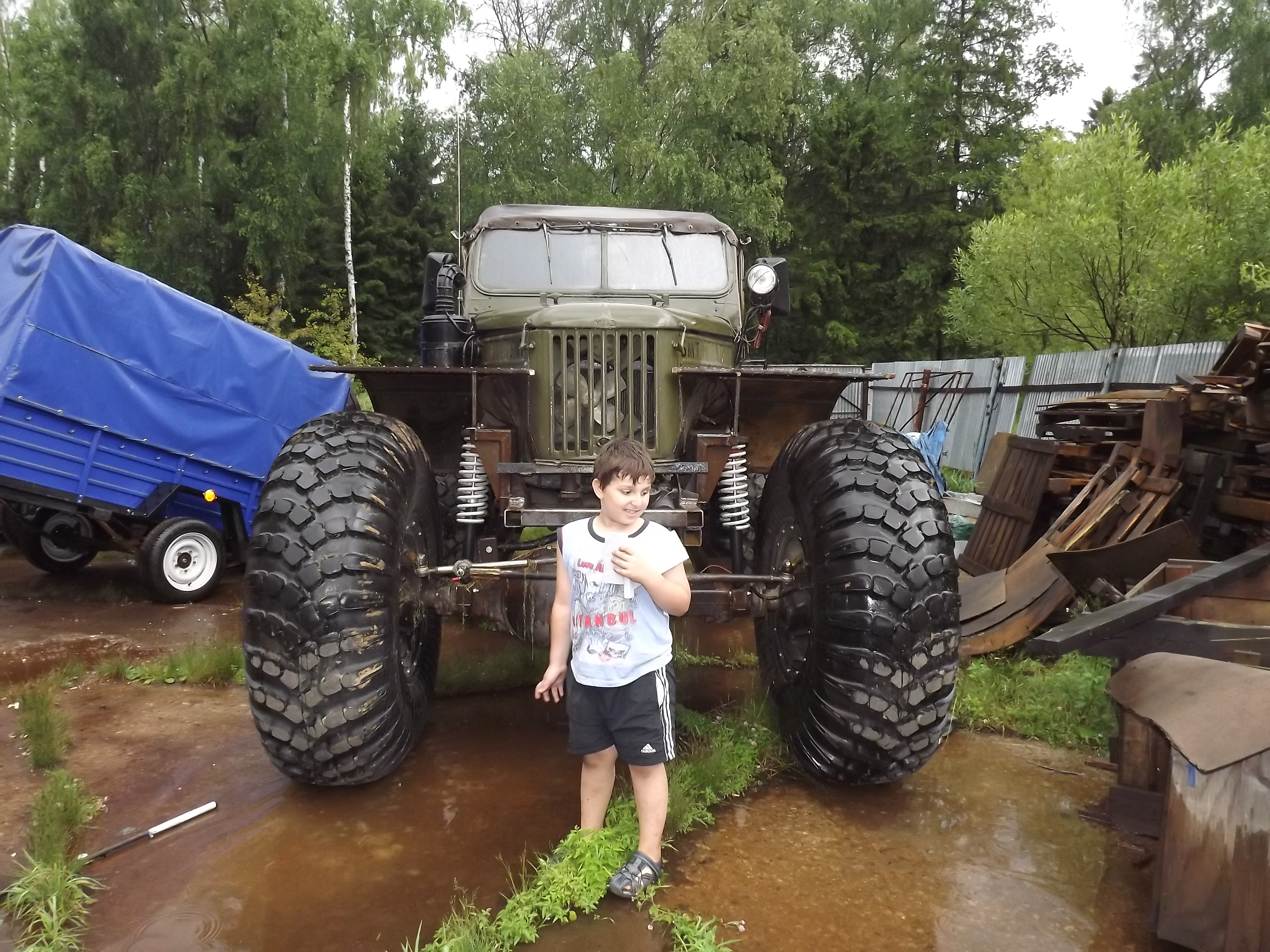 У которого пока не имени, не марки и не модели нет! Он просто дитье моих ребят. Сами сконструировали! И это дитье с высокой проходимостью, с 3-я мостами, с шинами пониженного давления, с регулируемыми аммортами, и плавником!!! Это чуда будет еще и плавать! Корпус из люмий, поднимали на раму хайджеком.