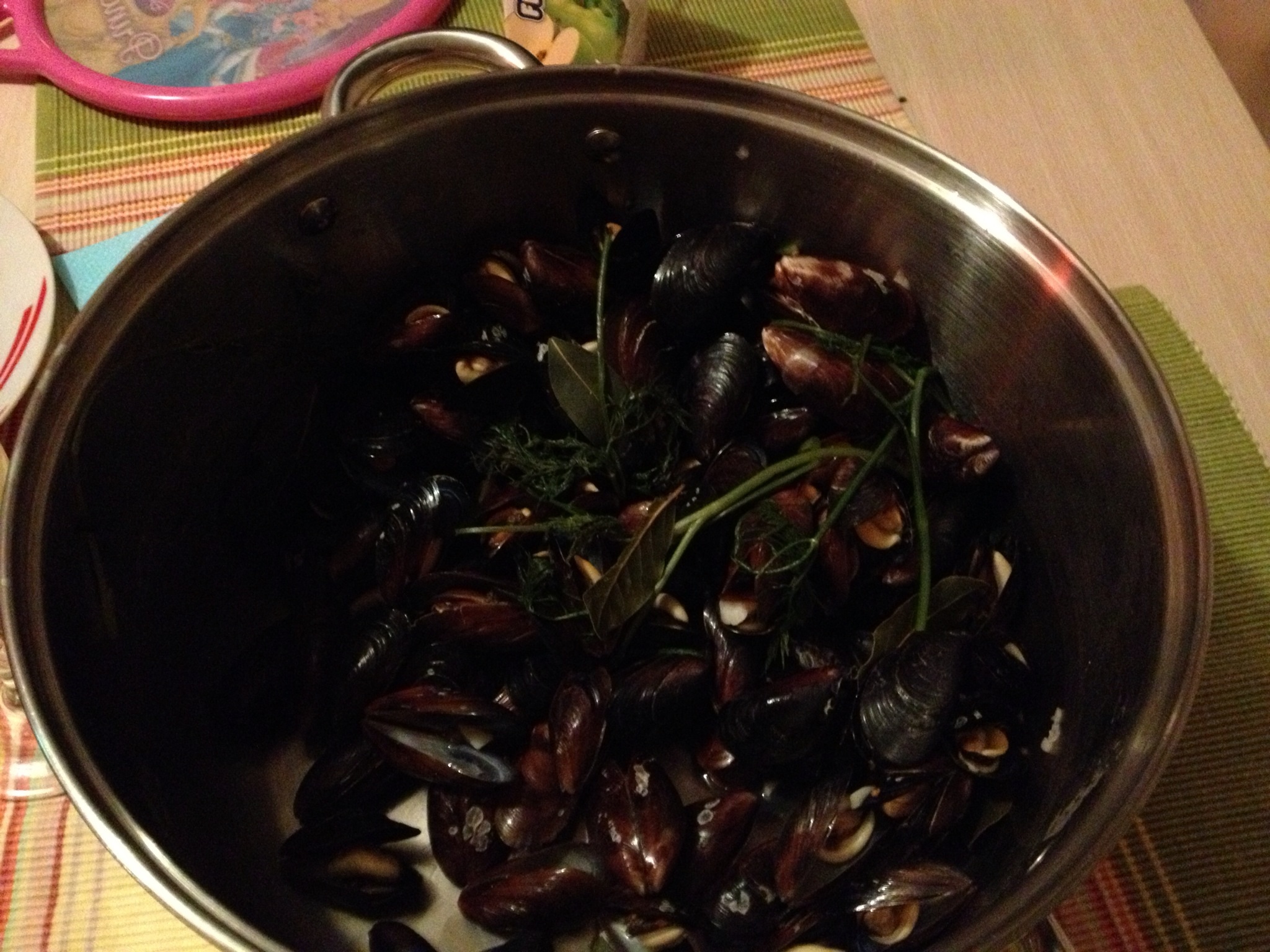Готовим сегодня мидии. Тут особых хитростей нет, но все же. Покупаем свежих мидий в панцире. Делаем для них "бульон" или "отвар". А делаем это так. Добавляем в воду соль, лаврушку, черный перец, укроп и чеснок. Доводим до кипения и кипятим минут 10-15.