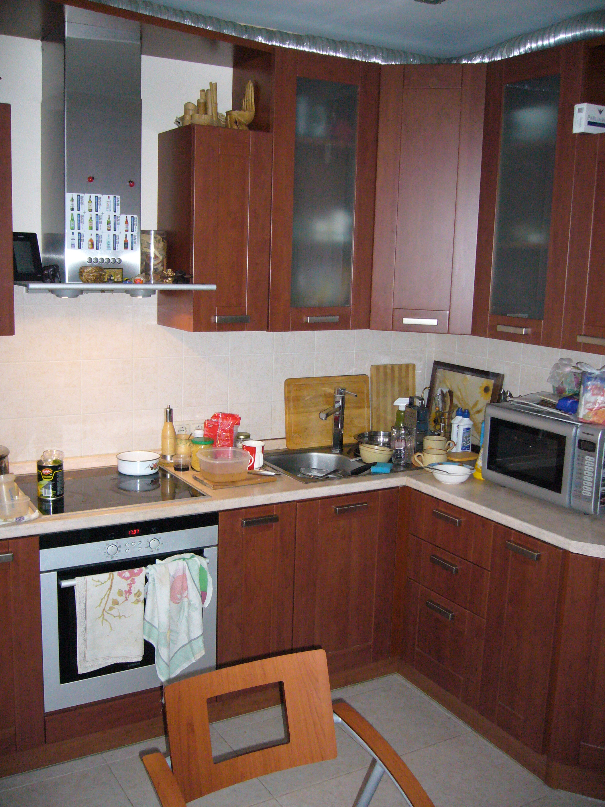Крайний слева холодильник, под ним морозилка, форма "угол" у нас одинаковая с тобой. Посудомойки нет, СВЧ не встроенная. По твоему эскизу площадь у тебя больше, так что можно думать.