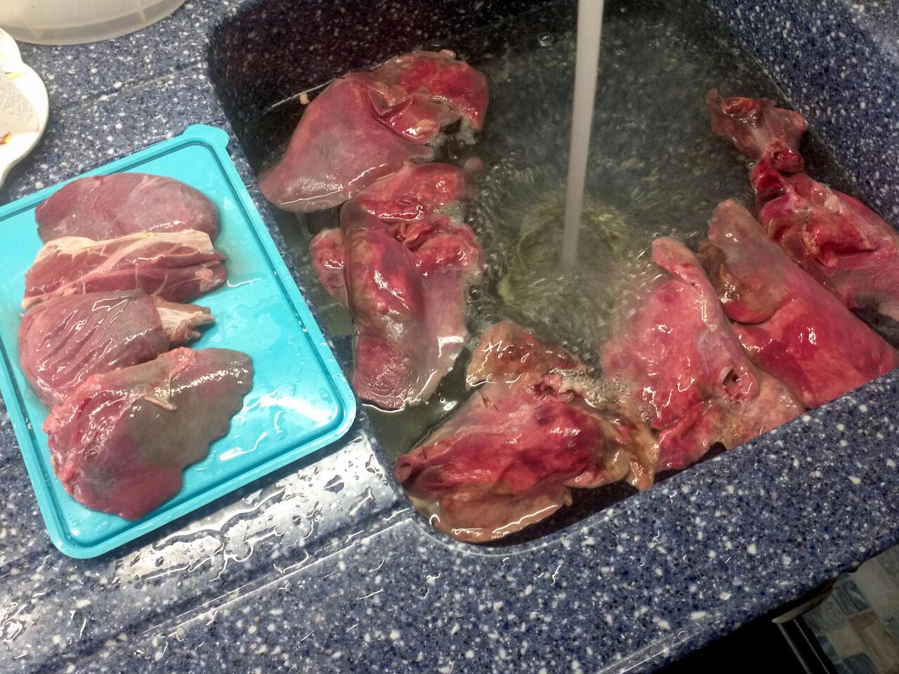 Лёгкие режем на небольшие куски, стараемся вырезать трахеи, я не вырезал,