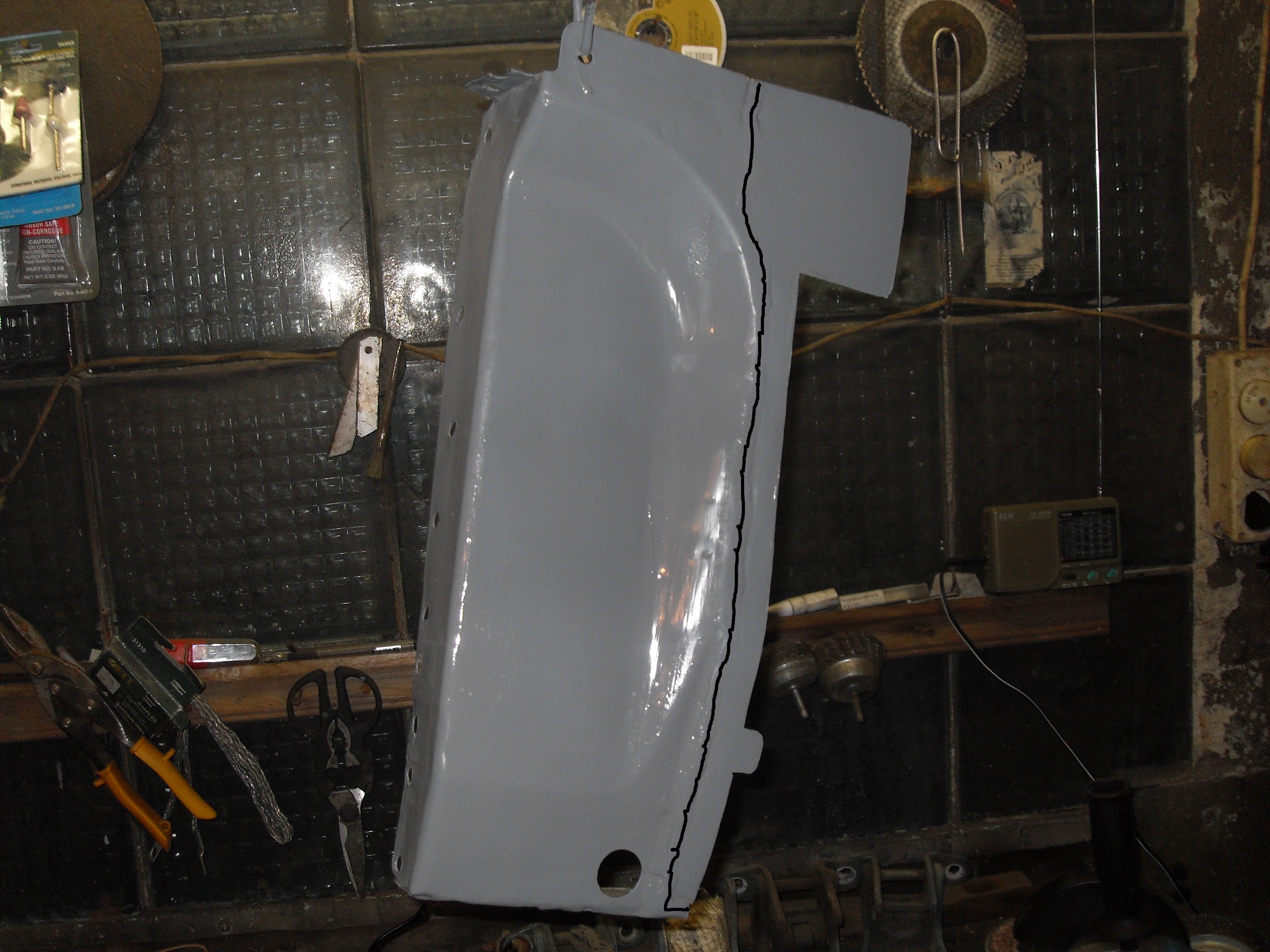 Нам смертным вообще никогда робота не купить. Естественно не буду же я пол кузова разрезать и разбирать для того что бы точечным аппаратом подлезть к какому-нибуть усилителю. Можно и полу автоматом в таких случаях обойтись. Ну например вот карман багажника правый. Внизу сгнил, гнилой участок был вырезан и изготовлен новый. На фото чёрным отмечен шов. После вся деталь была защищена до металла и прогрунтована. Как то так.