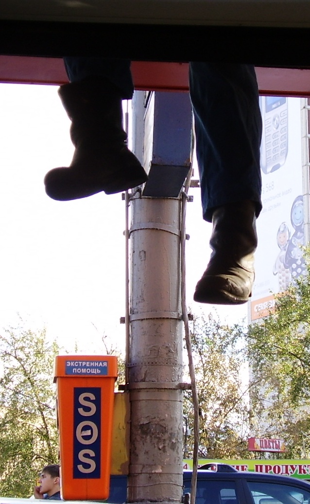 - мужик реально застрял, чинил рекламу и провалился, SOS просто в тему