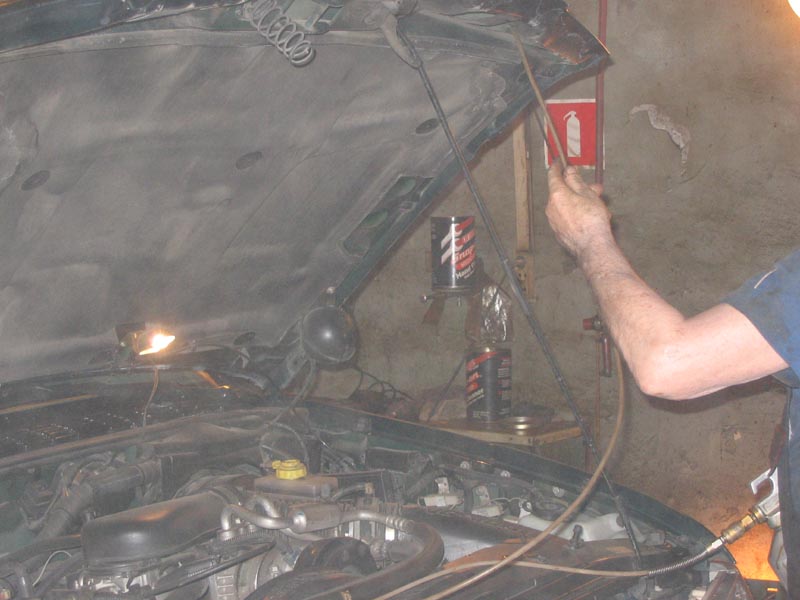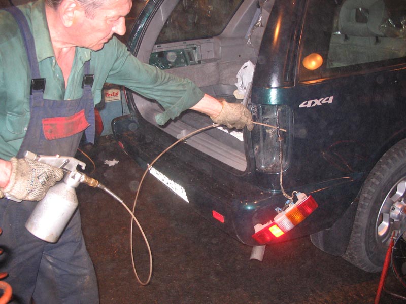 Второй – обработка мест сопряжения на поверхности кузова автомобиля всевозможного крепежа, ручек, дверей, капота двигателя, моторного отсека, дверей салона, двери задка и т.п. Для доступа в скрытые полости использовали длинные гибкие и одновременно жёсткие шланги, напоминающие внешним видом медицинские кембрики. Самого материала не жалели: из всех возможных мест – щелей, отверстий – сначала вылетала паровоздушная взвесь препарата «Rust-Stop», а затем начинал активно вытекать уже и сам антикор. Особо это было заметно при обработке дверей салона и двери задка. Именно из её углов долго стекал, а затем обильно капал желтоватого цвета препарат.