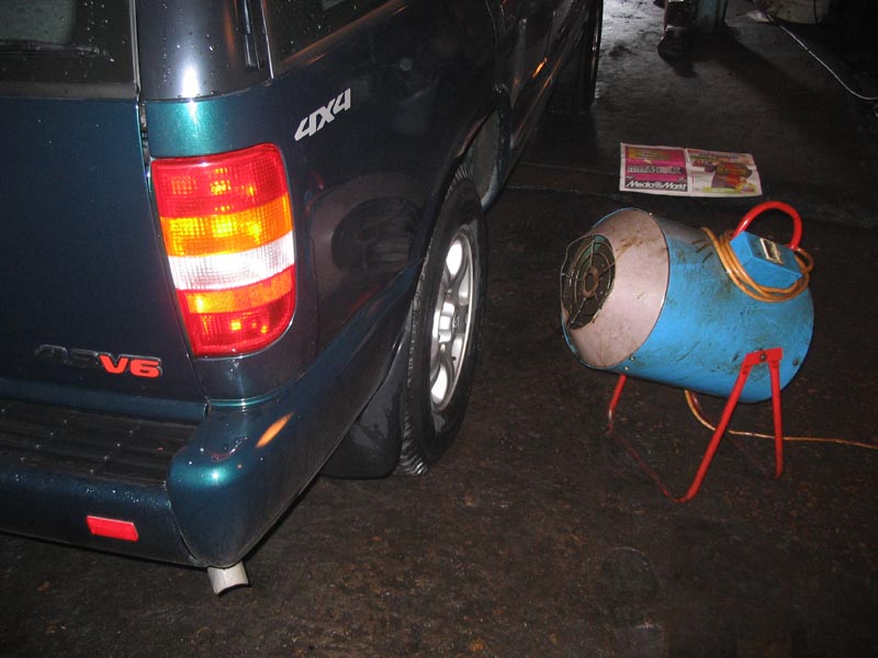 Первый – сушка днища и колёсных арок тепловыми «пушками». Одновременно с этим проводились подготовительные работы, которые включали в себя укрытие салона целлофаном от возможных брызг антикора, ковриков – газетами от неизбежной грязи и обеспечение доступа к скрытым полостям в салоне (проще говоря – очистка дренажных отверстий в нижней части дверей, демонтаж правого заднего блок-фонаря и снятие кожуха-шторки в левой задней части салона).