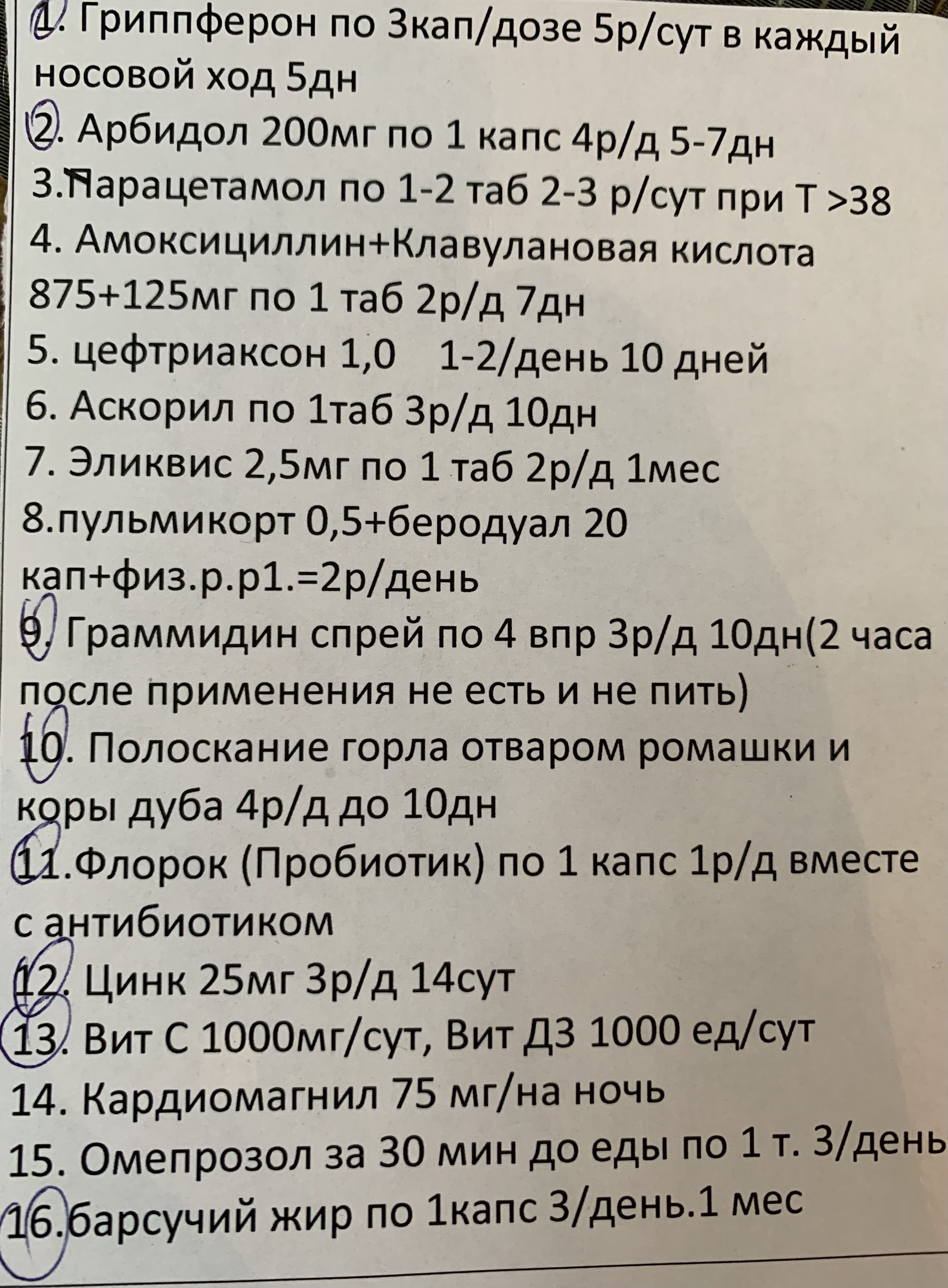 Теперь интересное - походу наша медицина достигла пика своей системности и совершенства - так как некогда входить в ситуацию и особенности каждого пациента врачам выдали вот такие листки, где в зависимости от состояния обводят лекарства, которые надо купить и пить. Если вы погуглите про каждое лекарство, то очень быстро поймете какие у вас должны быть симптомы, чтобы его вам назначили. Короче в принципе я не удивлюсь что девушки, которые сейчас ездят по домам просто волонтеры без медообразования.
