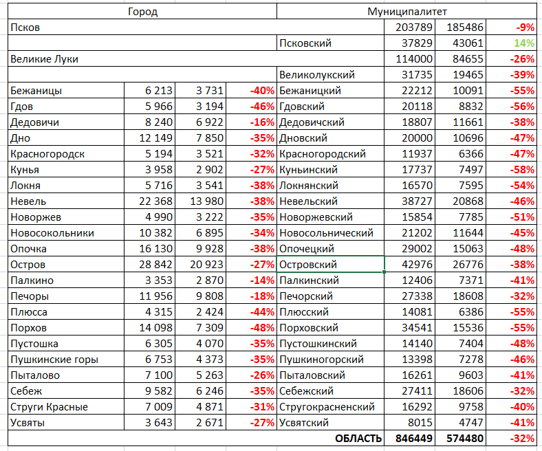 Вот численность населения по райцентрам Псковской области. Первая колонка - 1991-92 год (частично 1989, и один город - 1997 год), вторая - 2025 или 2021 (не везде есть 2025 год).