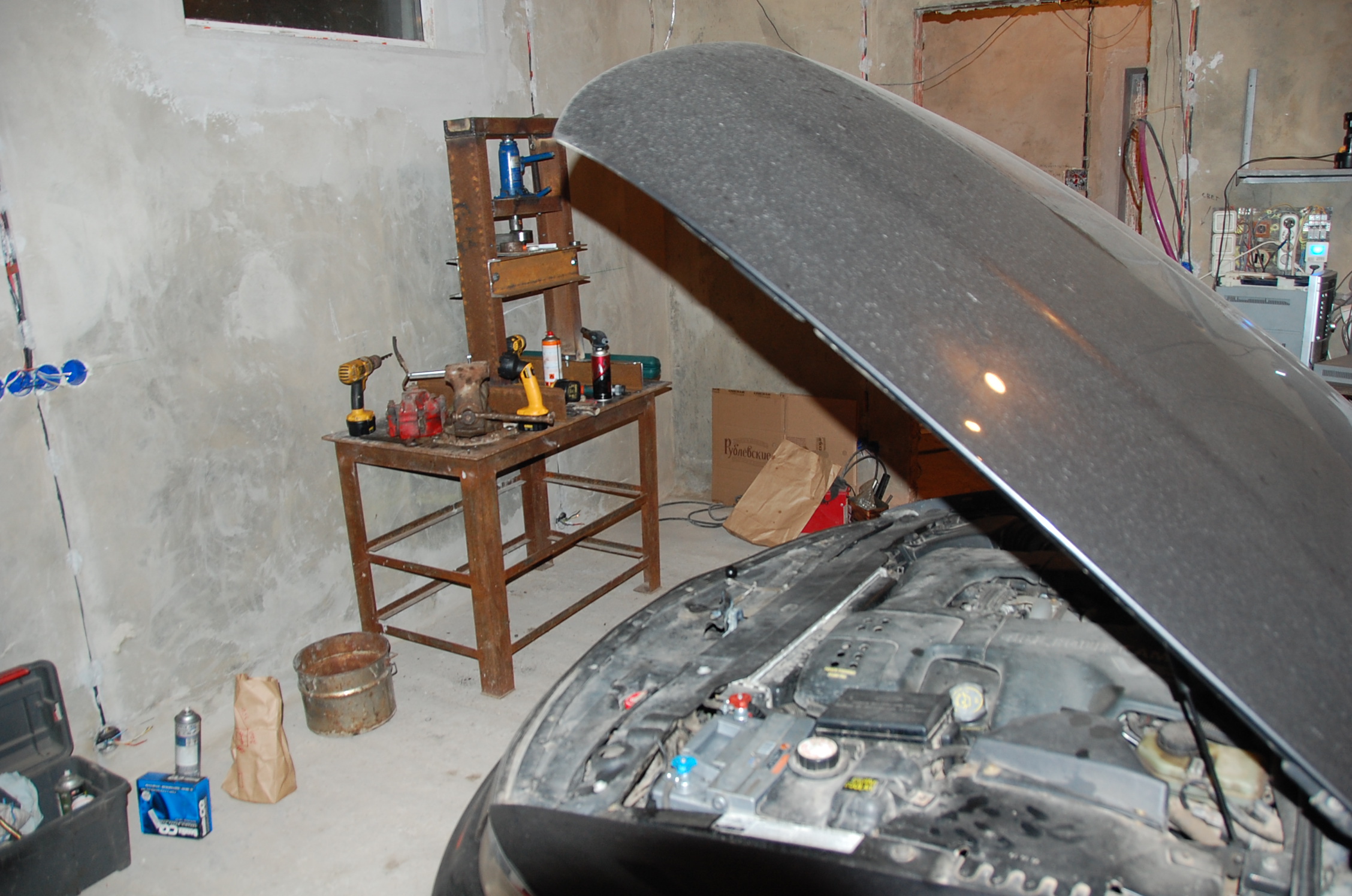 А гараж не доделан ещё.Чуть-чуть терпения не хватило подождать,чтоб в нормальные условия машинку заселить.За лето приведу в порядок.Подъёмник тоже поставлю.Кто ж как не сам смотреть за машинкой будет!?