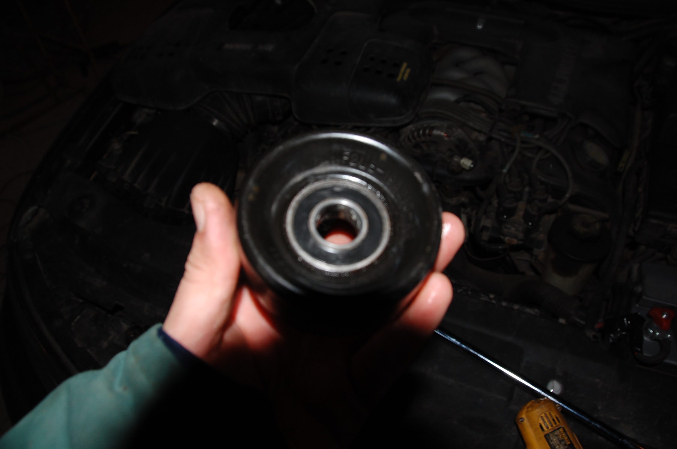 Замена подшипника в ролике проблемы не состваляет, при наличии пресса и оправки. Пресс вижу, оправки тоже описаны в процессе. Только вот с точной посадкой в паразитный ролик может быть накладочка, нужно чтобы плоскость контакта шариков с обоймами совпала со средней линией ремня, если не совпала - подшипник не жилец. Рантик в посадочном гнезде подшипника ролика с натяжителя как раз для этого.