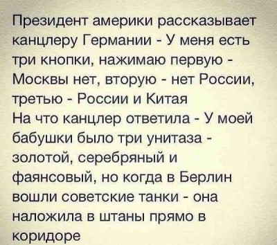 А.Меркель говорит :- Сейчас приедет Путин , с кем первым поздоровается - тому **здец !!!