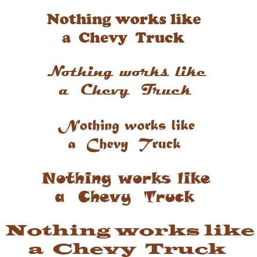 Зад, наверное лучше первый вариант, где буквы ровные. Единственный нюанс, а не имеет смысл сделать надписи одинаковой длинны, слова "Chevy Truck" написать заглавными буквами ну а сами буквы везде по толще сделать, наверное как во втором варианте? Как думаешь?