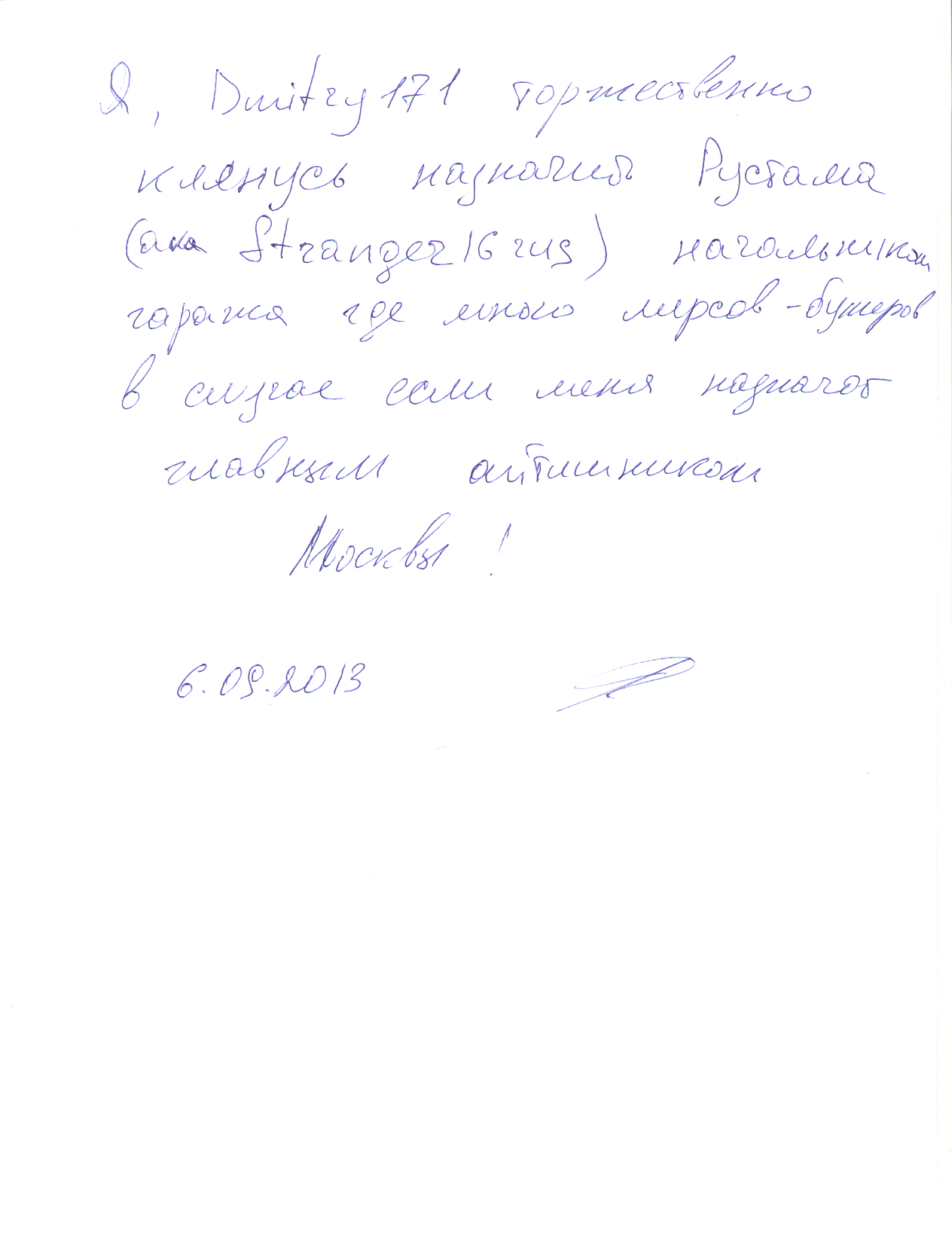 Рустам, я человек конкретный в отличии от некоторых пи****болов - поэтому вот тебе моя расписка!SerGT писал(а):Дим я тоже кое-что умею... Не забудь, я первый голосовал за тебя!Stranger16rus писал(а):Дим. Если прокатит, возьми меня начальником гаража к себе? У них там куча мерсов-бумеров. Отвечаю - экономить на обслуге автопарка буду невероятно. Воровать первые три дня вообще не буду! Ну пока разберусь что к чему, сам понимаешь, время нужно. Маяки и сгу буду раздавать ТОЛЬКО за ОЧЕНЬ дорогой виски.