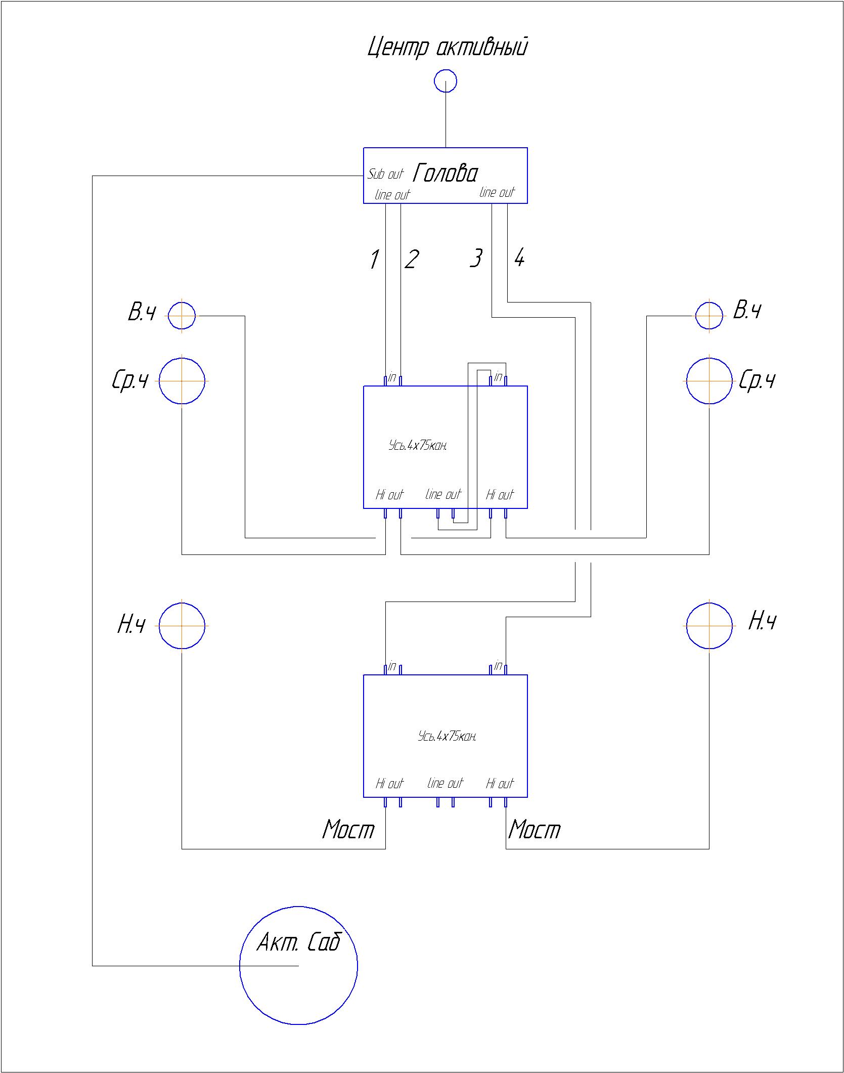на каждый канал. Тыльный усь. 4-х канальный, на всяк случай. Активный саб.