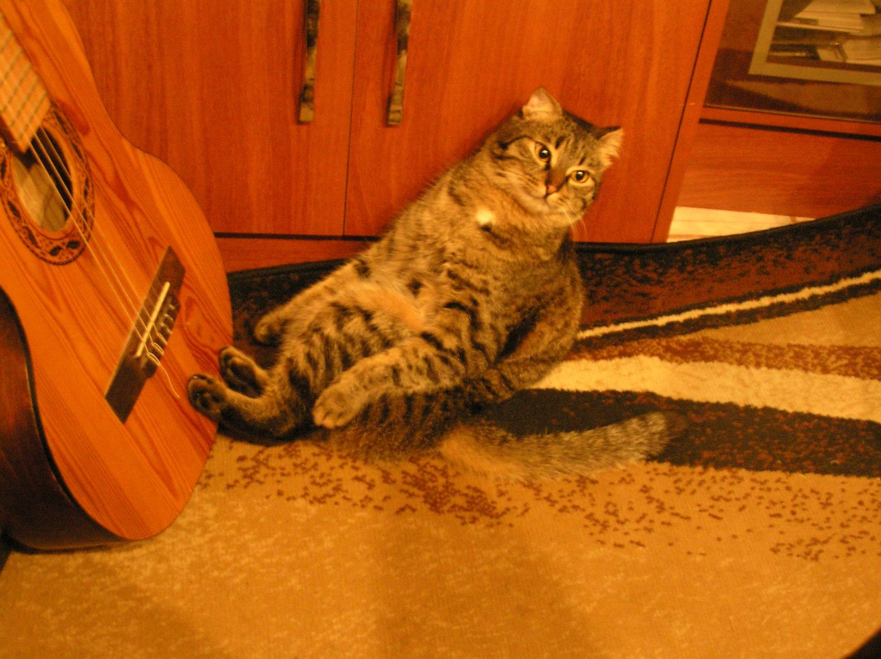 Ночью играет на гитаре,не грызёт а лапой по струнам чем конечно же будет
