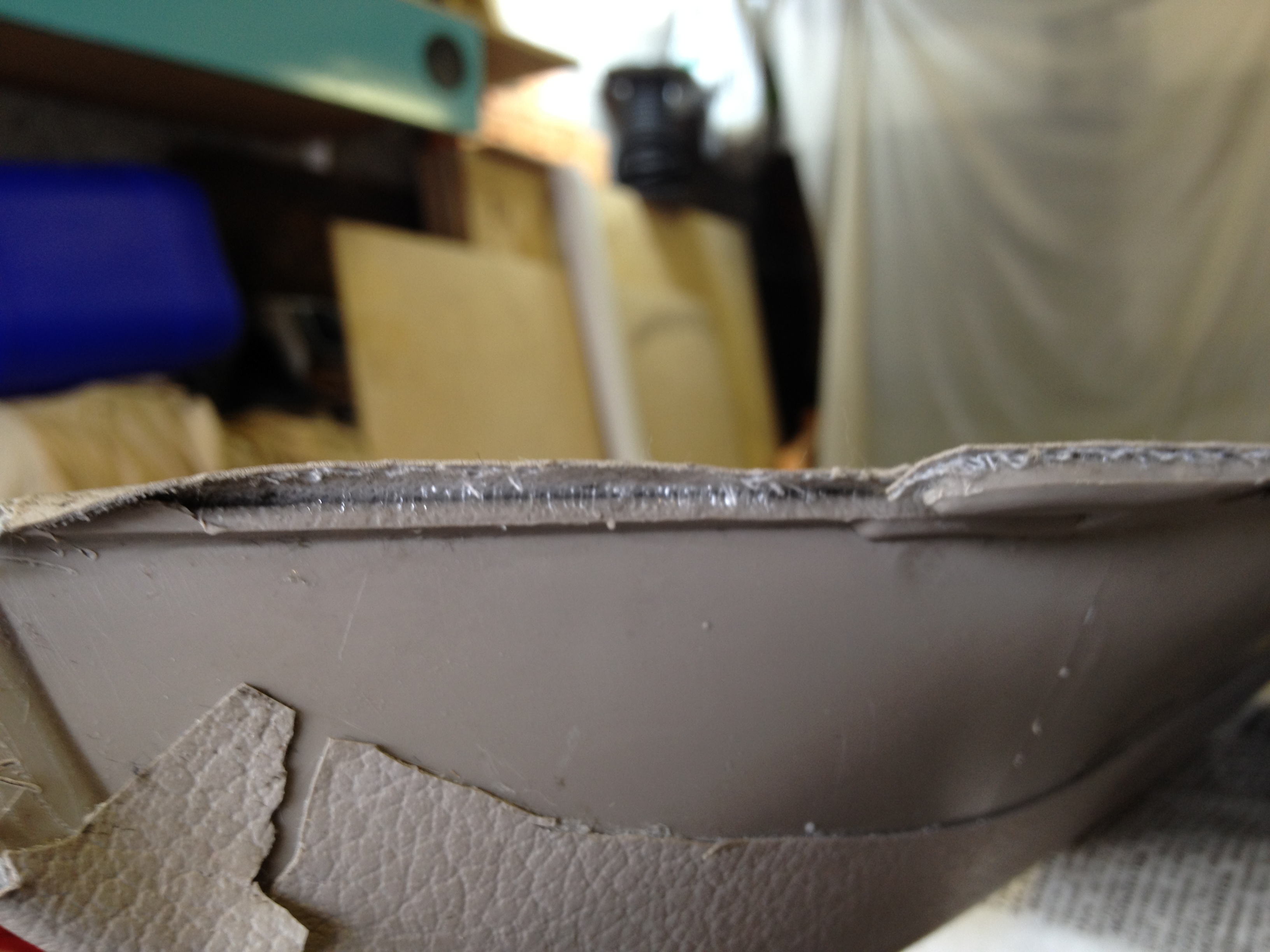 Это деталь, которая будучи обтянутой пролежала ночь в гараже. Вот такие неровности видны на обтянутых деталях из-за тонкого материала. Отслаивание клеевого слоя на сгибах, точнее в местах напряжения материала. Отслаивание армирующего слоя. Одним словом - полное УГ.