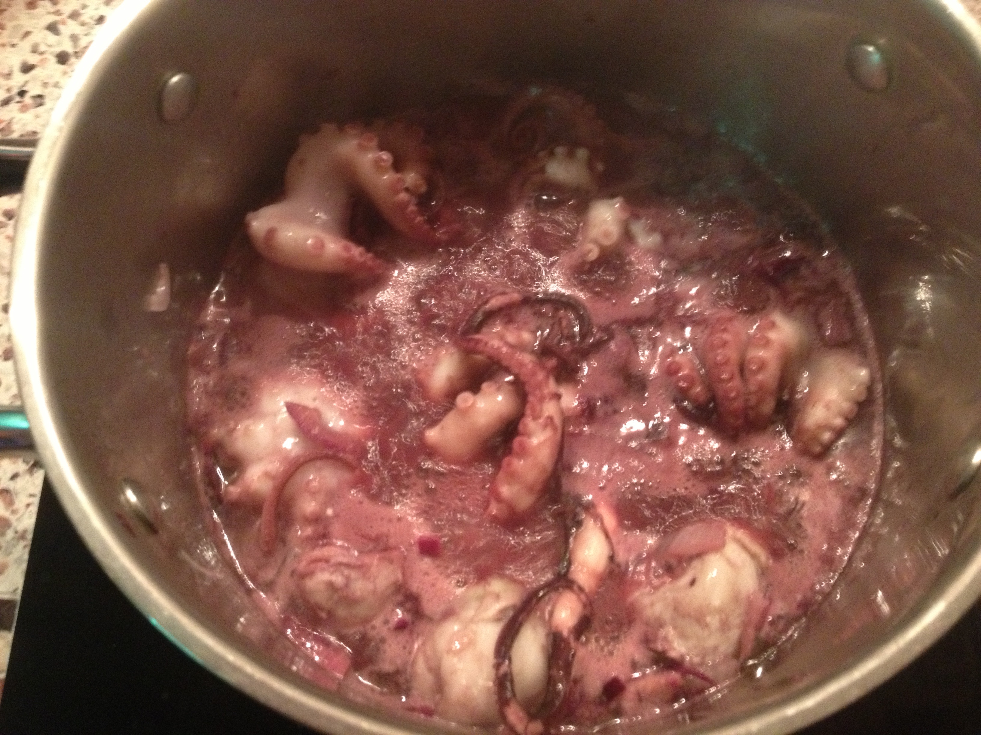 Берем кастрюлю, льем в нее немного оливкового масла и обжариваем мелконарезанный репчатый лук. Буквально три минуты, добавляем разделанных осьминогов. Немного обжариваем и добавляем красное сухое вино.