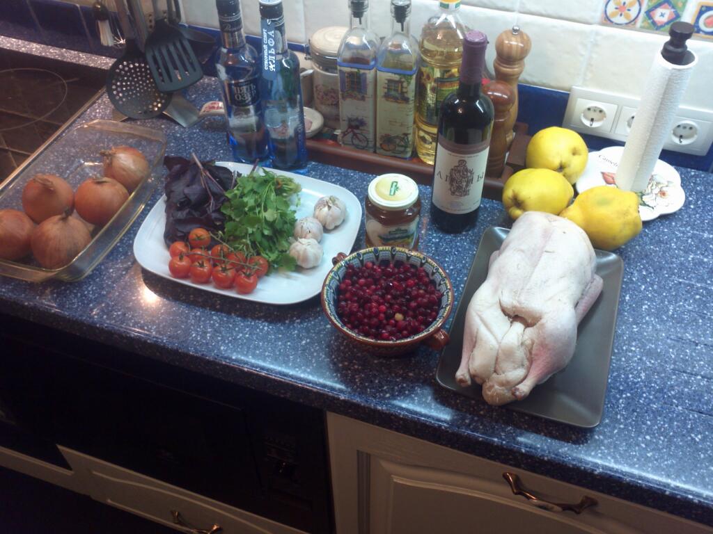 Для утки нужна утка, айва, клюква, мед, красное вино.