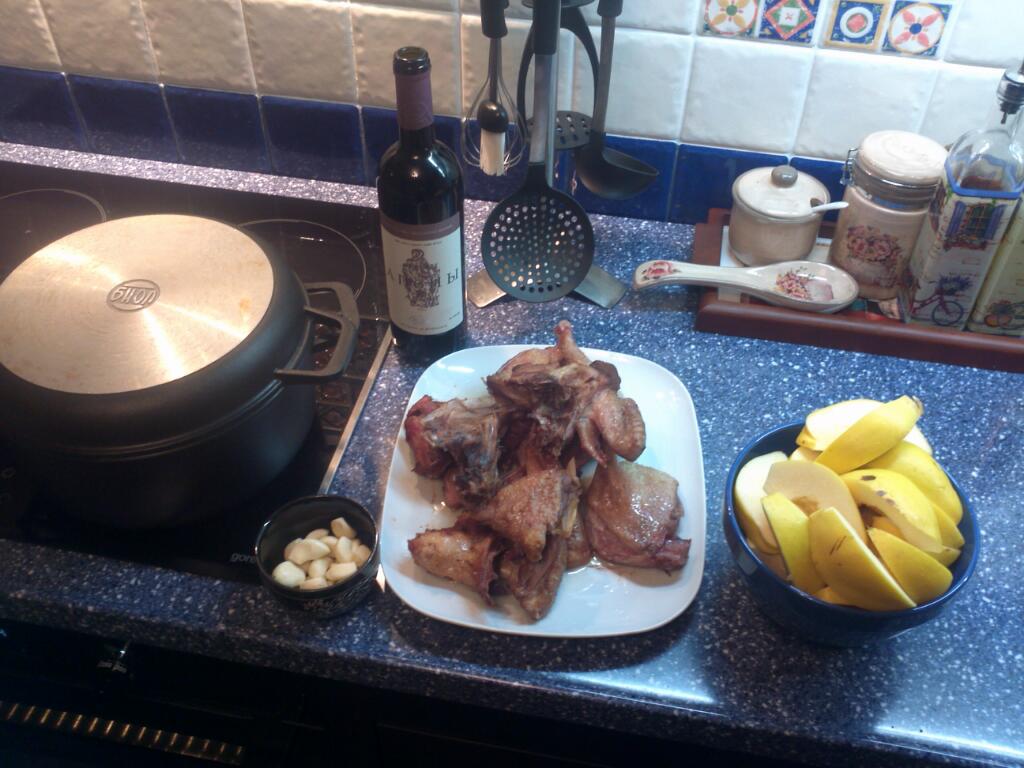Кидаем в подходящий чан утку, айву, чеснок, заливаем вином, чуть больше