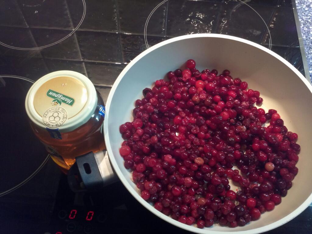 Вбрасываем на сковородничек клюкву, ставим на маленький огонь и выпариваем лишнюю жидкость