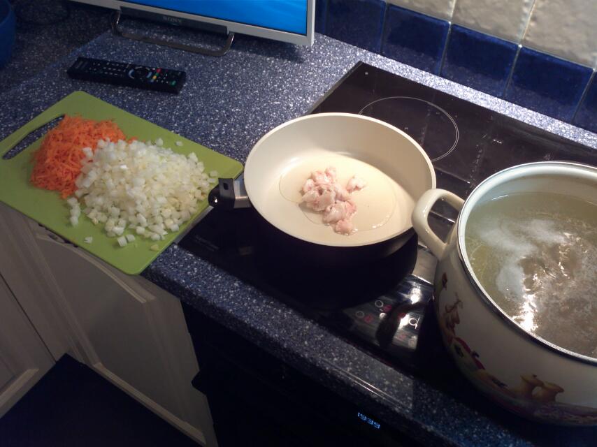 Шинкуем лук и морковь.