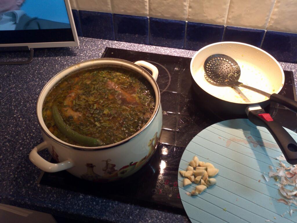 Чутка раздавливаем чеснок, режем и в суп.