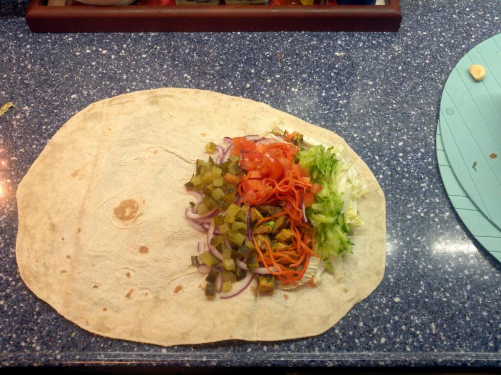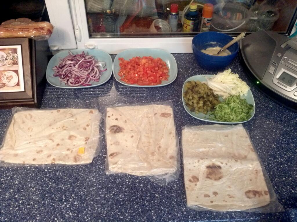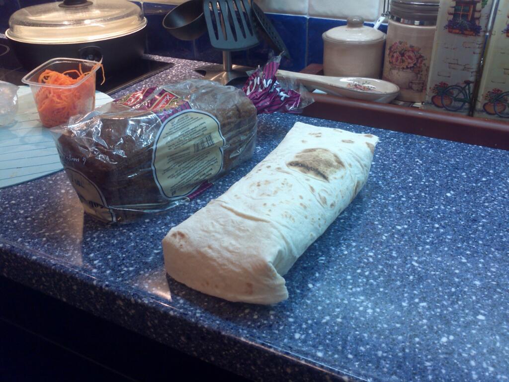 Должна быть морковка по-корейски и сыр, первую я в магазе не обнаружил, сыр на фото не попал-