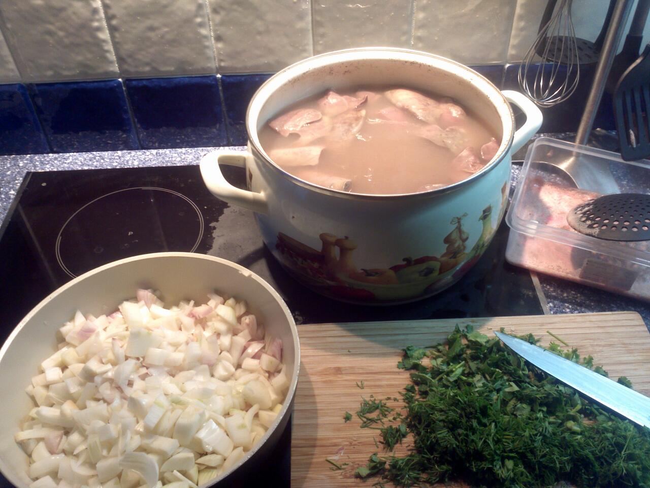Закидываем в кипящую воду продукты, снимаем пену (её много).
