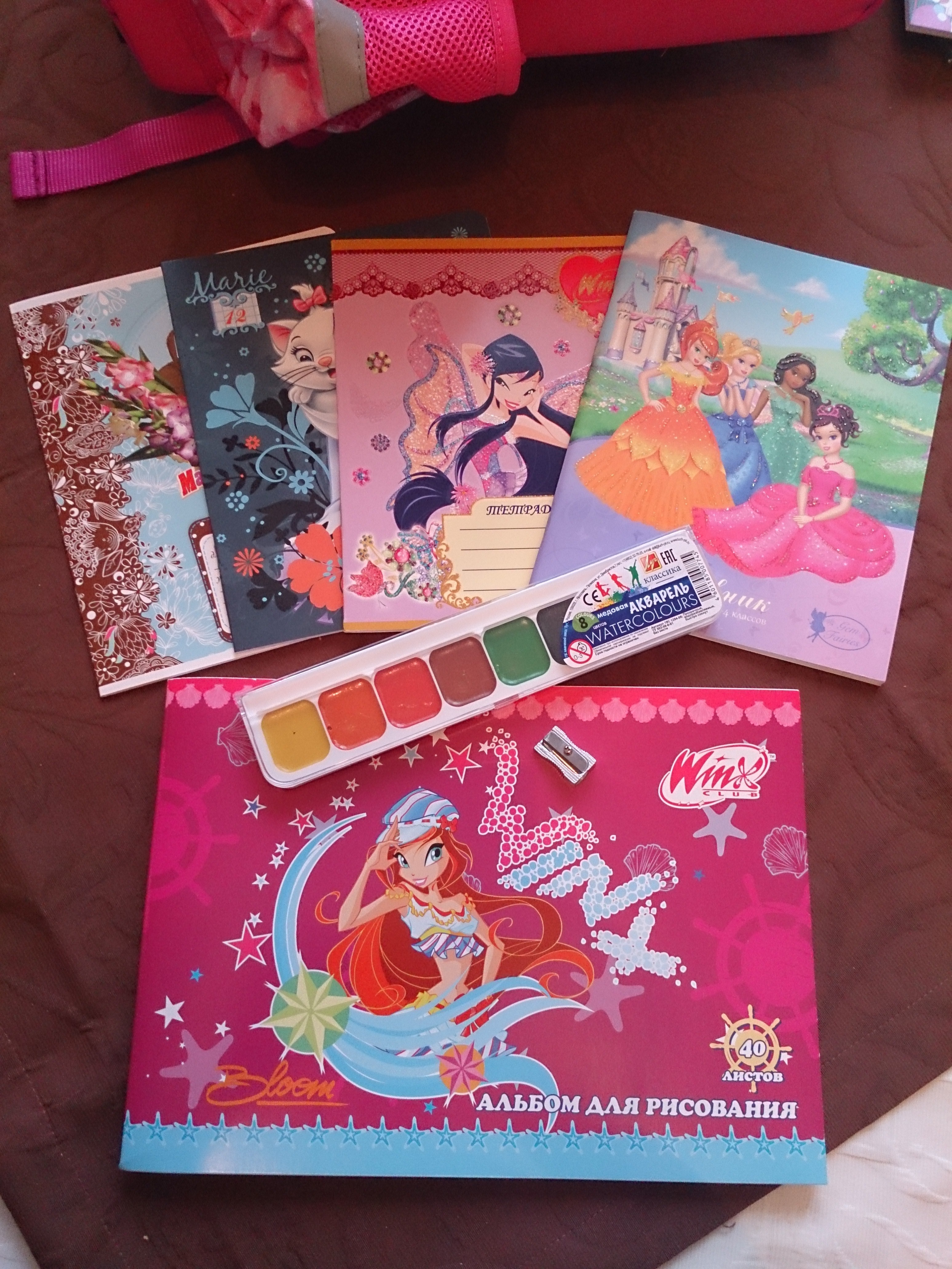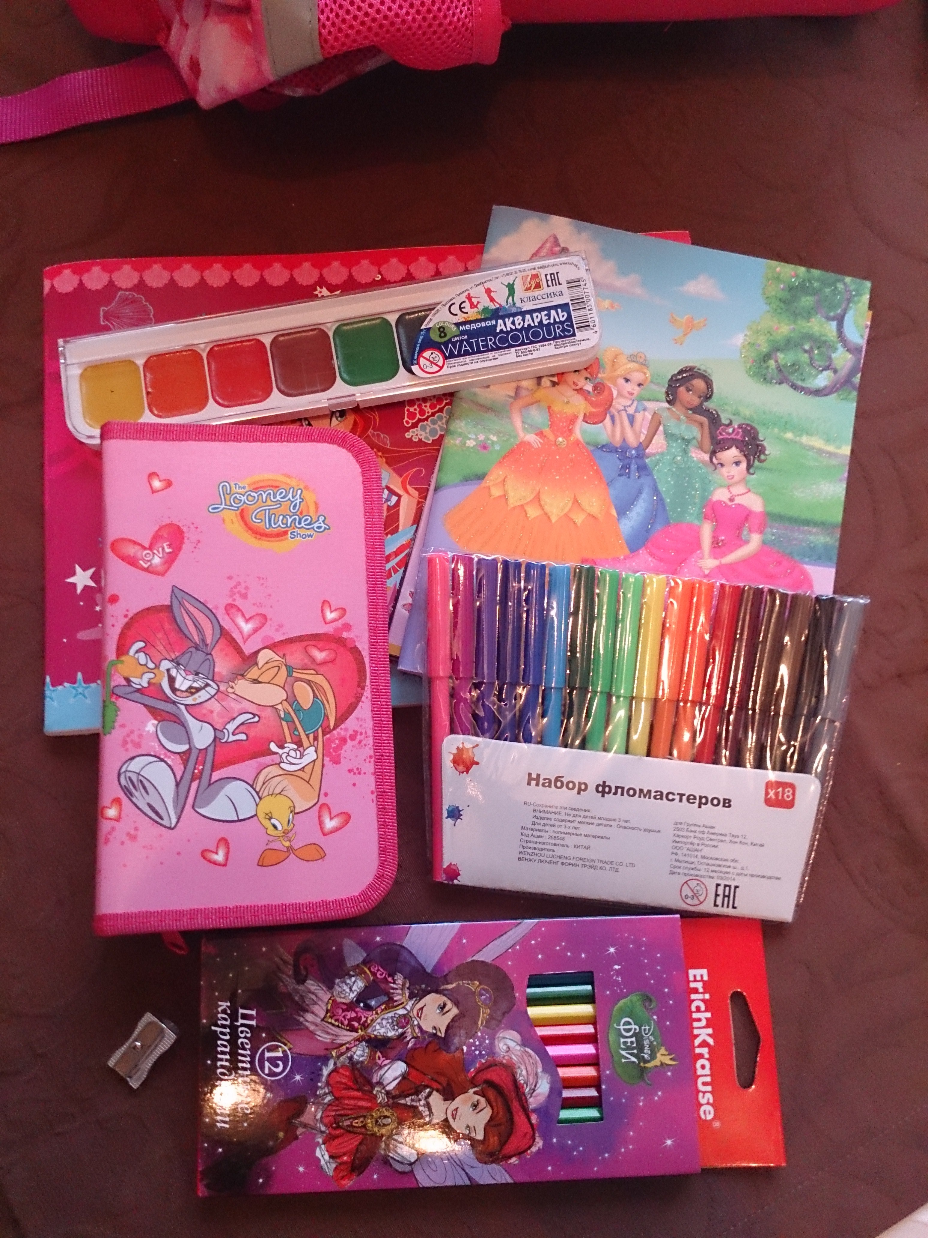 поскольку нам с Тамарой достался девочковый портфель, фото его с содержимым будут девочковые с феечками и принцессами