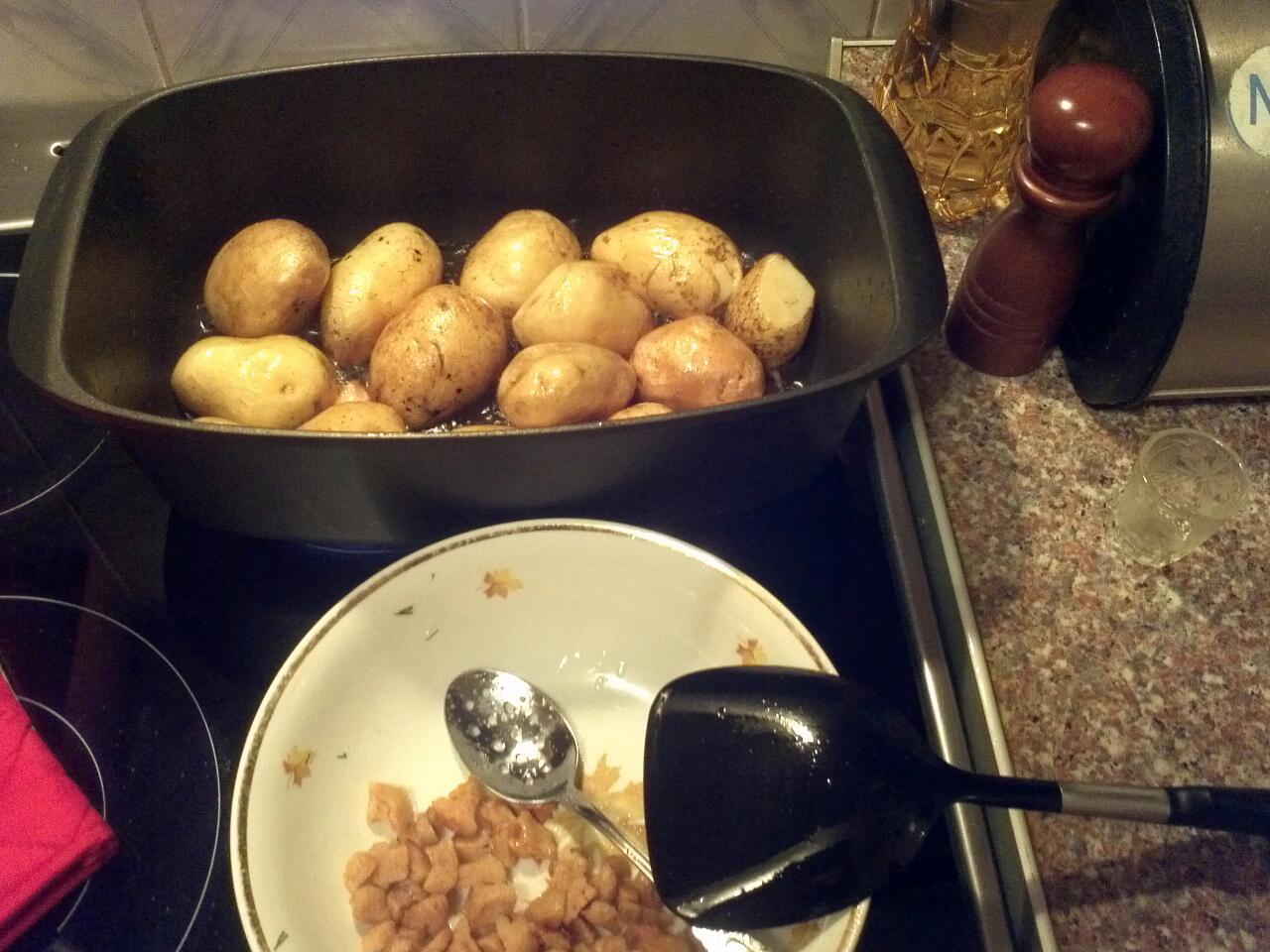 Солил мясо при обжарке, картошку в шкуре бесполезно.