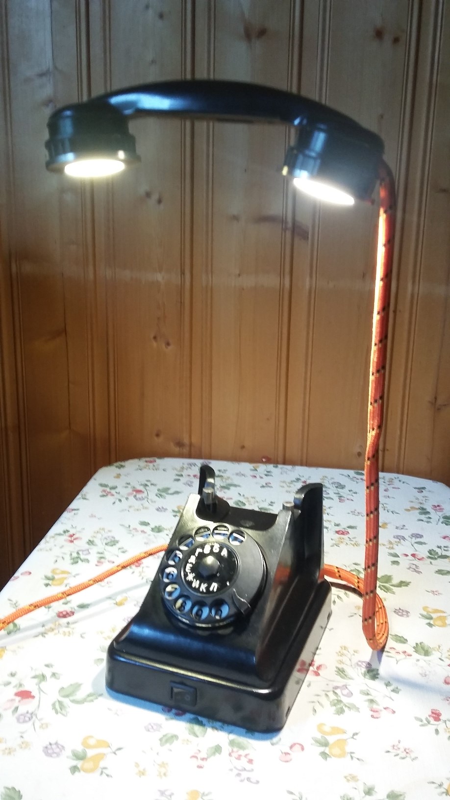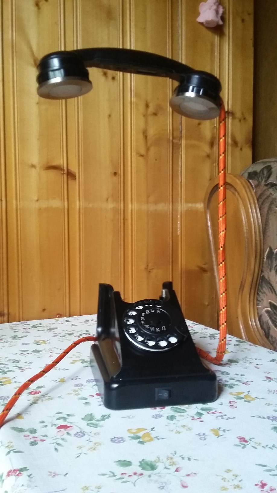 У подруги 45 лет, вот сделал ей в подарок настольную лампу из телефона VEF пятидесятых годов. Телефон взял по случаю на барахолке в Измайлово. Состояние - на 5, в номеронабирателе диск с цифрами на эмали!