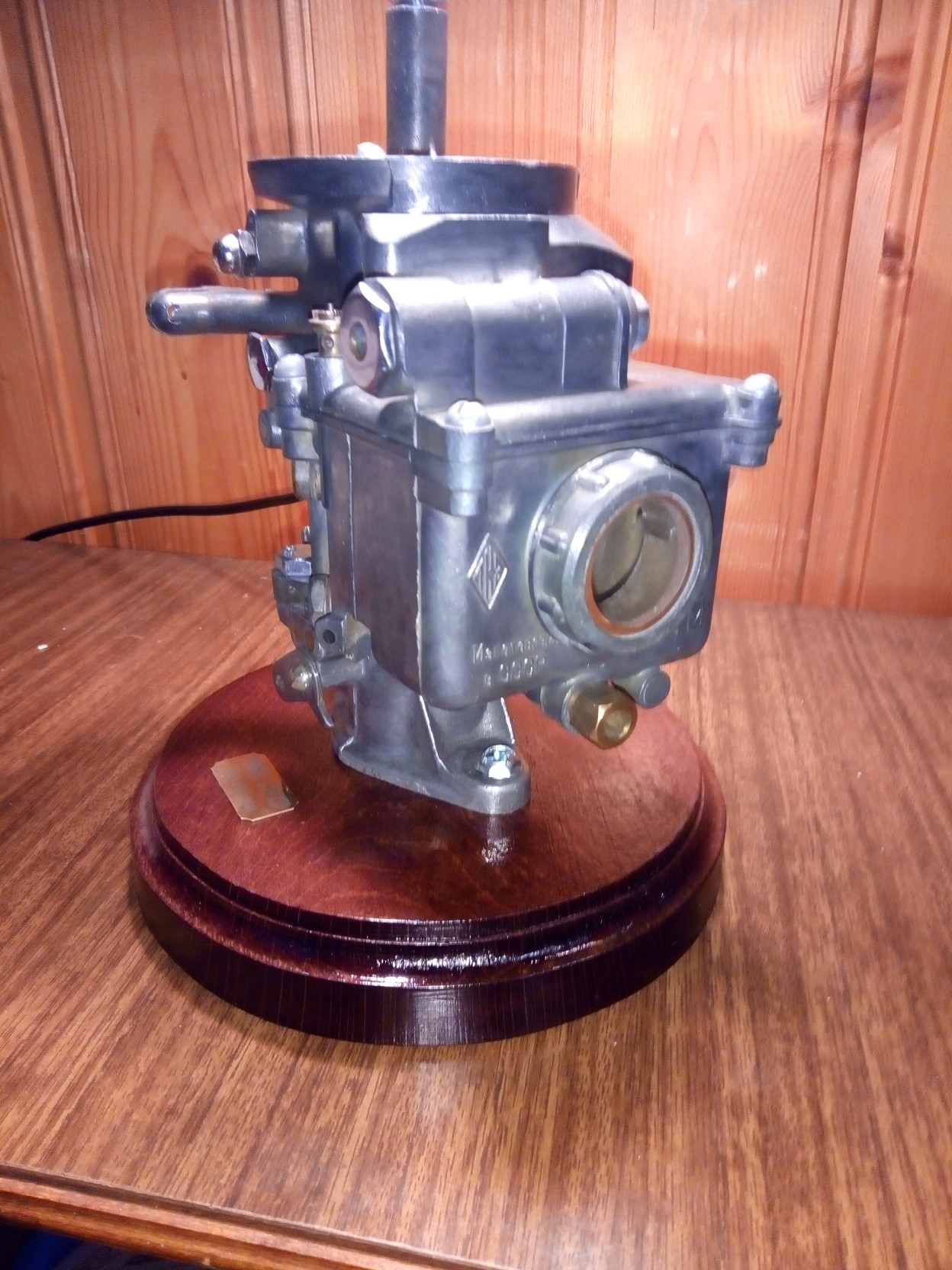 Лот №2. Настольная лампа - карбюратор ГАЗ 21. Абажур - фильтр нулевик в хромированной кастрюле. Внутри две лампы Е 14. Основание - мореный бук.