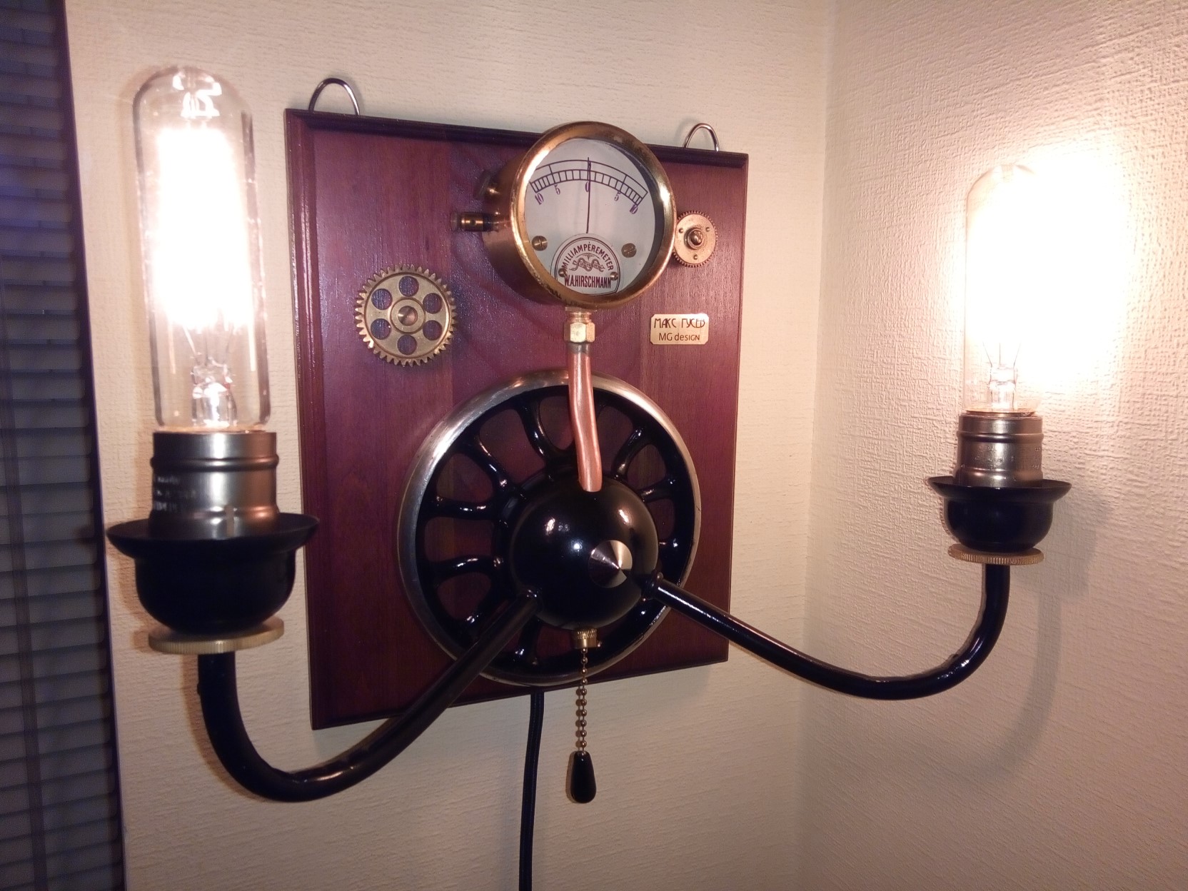 Лот №5. Бра стимпанк. Две лампы Эдисона, маховик Singer, амперметр начала XX века. Доска - мореный дуб.