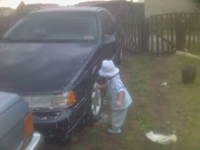 помогает мыть машину, сама взяла паролон и начала мыть диски.