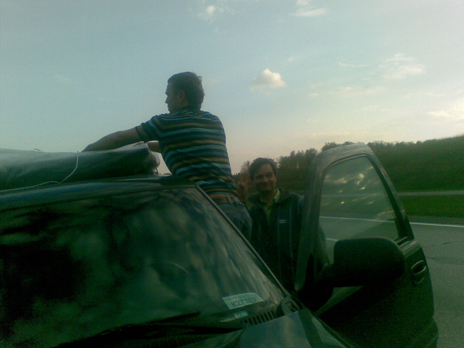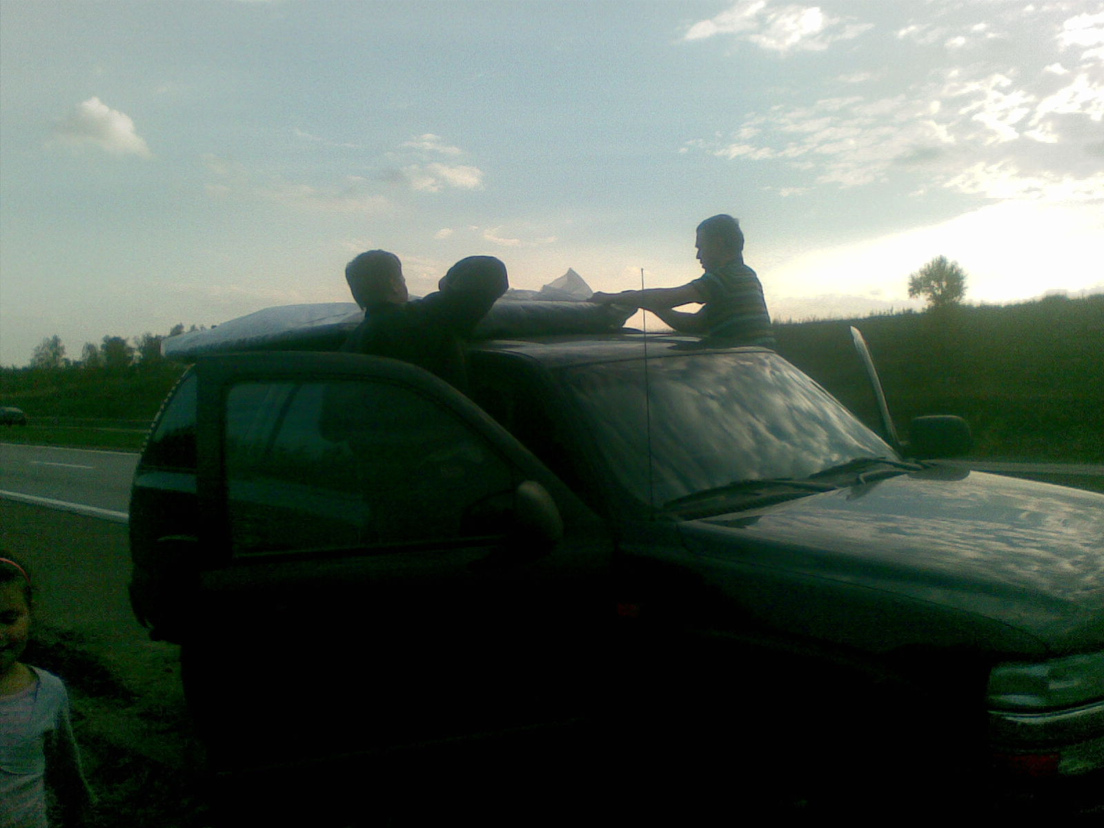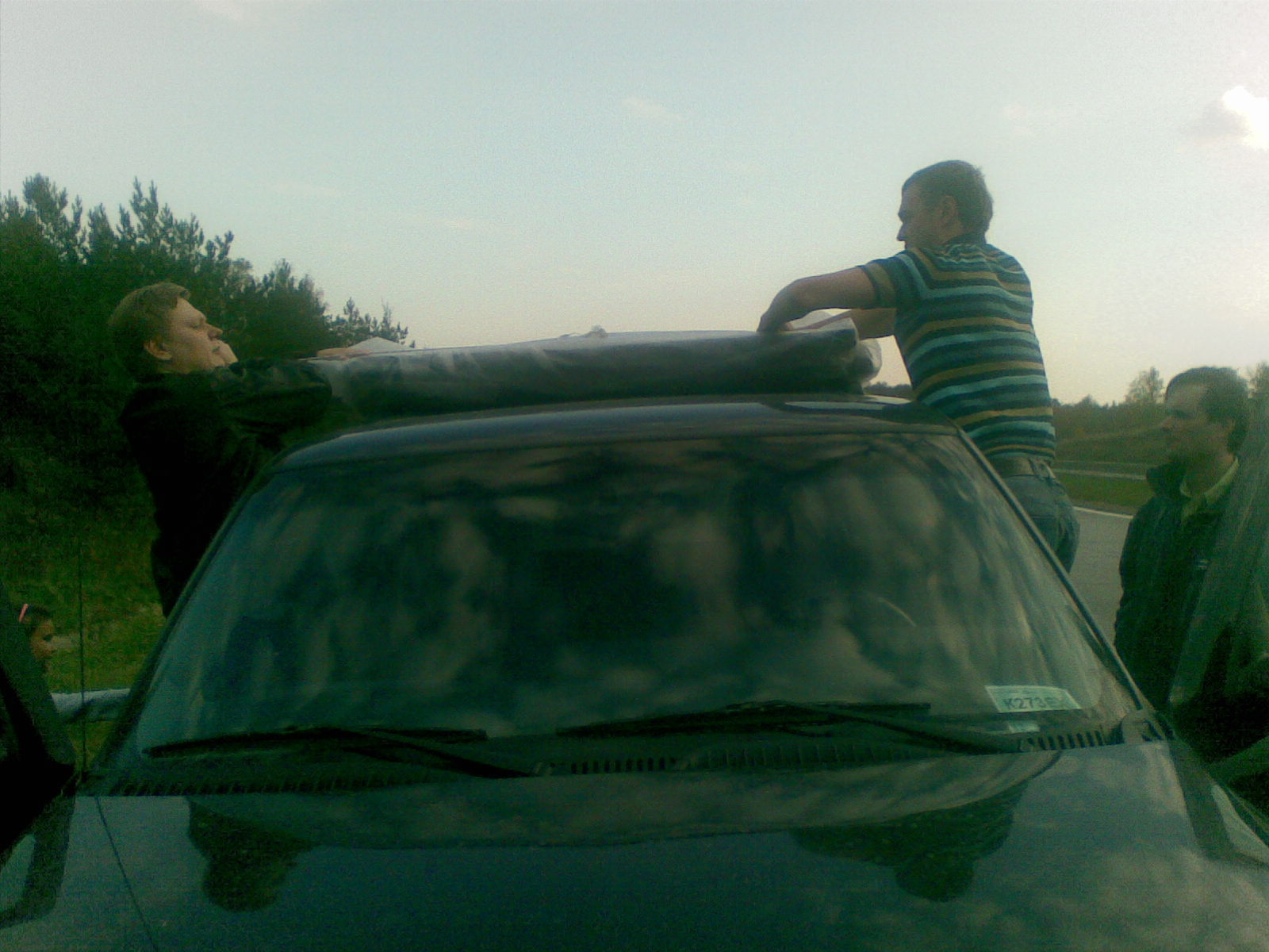 Пришлось немного (200р) приплатить вахтерше, что бы она открыла вышла на работу к 8-ми, старушка не подвела. Артисты тоже были почти все на месте, и с ними была «Ширма» которая приняла самое живое участие в нашем путешествии. Такое живое, что не раз ее хотели оставить где-нибудь на пол дороге в кювете. Наверное, сантиметры вещь очень разная в зависимости от того как на них посмотреть. Ведь когда мне сказали, что надо будет везти с собой ширму 160 на 150 см эти самые 160 см воспринимались чем-то небольшим по сравнению с габаритами настоящего американского трака. Однако, когда мы пытались все вместе запихнуть ее в Женин дишн, она зараза такая, не вошла даже по диагонали. Оставалась надежда на задержавшегося Лешу (Silver) и его Таху. Он же привез немного сонного Диму (Dima). На его машину и примотали эту злополучную ширму. Сколько же раз он, наверное, пожалел об этом.