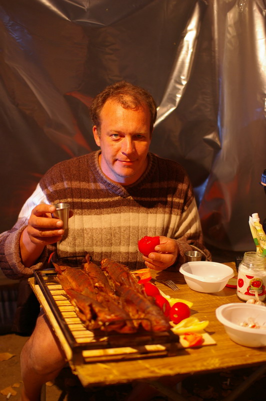 Выехали вдвоем + цобако Скай в 17:00 26.09.10. В Харабалях были в 7 утра на следующий день. Особо не гнали, ночь все таки. Затарились на рынке местными вкуснейшими овощами и фруктами, баранинки не забыли прикупить по 150 за кг. ), и двинули на берег. До вечера успели разбить лагерь и накачать лодку, слегка и сами накачались в процессе. Настроив плавсредство, прокатились по водоему, проинспектировали переспективные места лова. Вернувшись в лагерь, обнаружили пропажу почти всего мяса, которое опрометчиво оставили в досягаемом для местных дворняг месте. Скай потом в течении 3-х дней находил в кустах объедки собачьего ужина и наслаждался остатками. Стало не так обидно, хоть собачке перепало немного.
