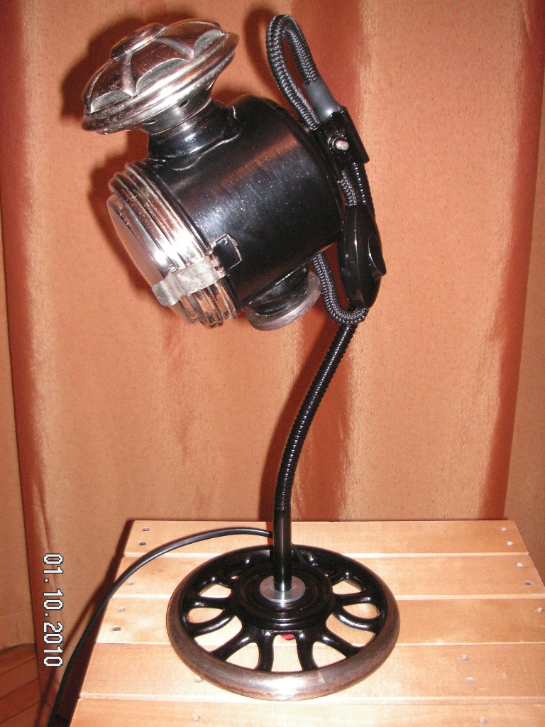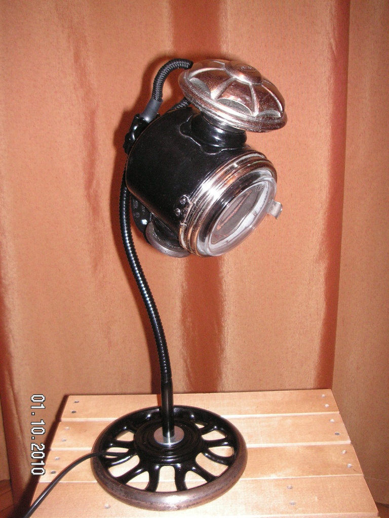 Итак, недавно на барахолке мне посчастливилось по дешевке купить ацителеновый фонарь самого начала 20-го века. То ли автомобильный, толи каретный - сие нам неведомо. Сразу решил сделать из него очередную настольную лампу. Хром в не плохом состоянии и я его не трогал, оставил "благородную патину". В качестве основания использовал маховик от швейной машинки "Зингер", от нее же и некоторые мелкие детали. Корпус и спицы маховика зачистил и покрасил в радикально черный цвет (собственно, как и было 100 с лишним лет назад). Ножку ампутировал от специально приобретенной лампы-донора, стекло, взамен родного плоского, мутного и уже основательно потрескавшегося, подошло от противотуманки "made in China", приобретенной в Южном порту. Немного поколдовал с электрикой и вкрячил вместо фитиля патрон под галогенку. Для пущей винтажности заправил проводку в чулок от репшнура, из которого удалил сердцевину. Получиля шнур в ниточной оплетке. Вот результат: