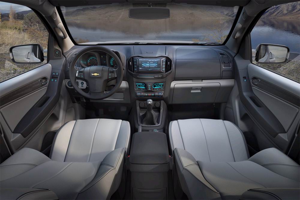 В интерьере нового Chevrolet Colorado, прежде всего, бросаются в глаза симметричная центральная консоль, которую венчает 7-дюймовый дисплей, прошитая нитью трехспицевая кожаная многофункциональная "баранка" и оригинальный щиток приборов с бирюзовой подсветкой и красными стрелками.