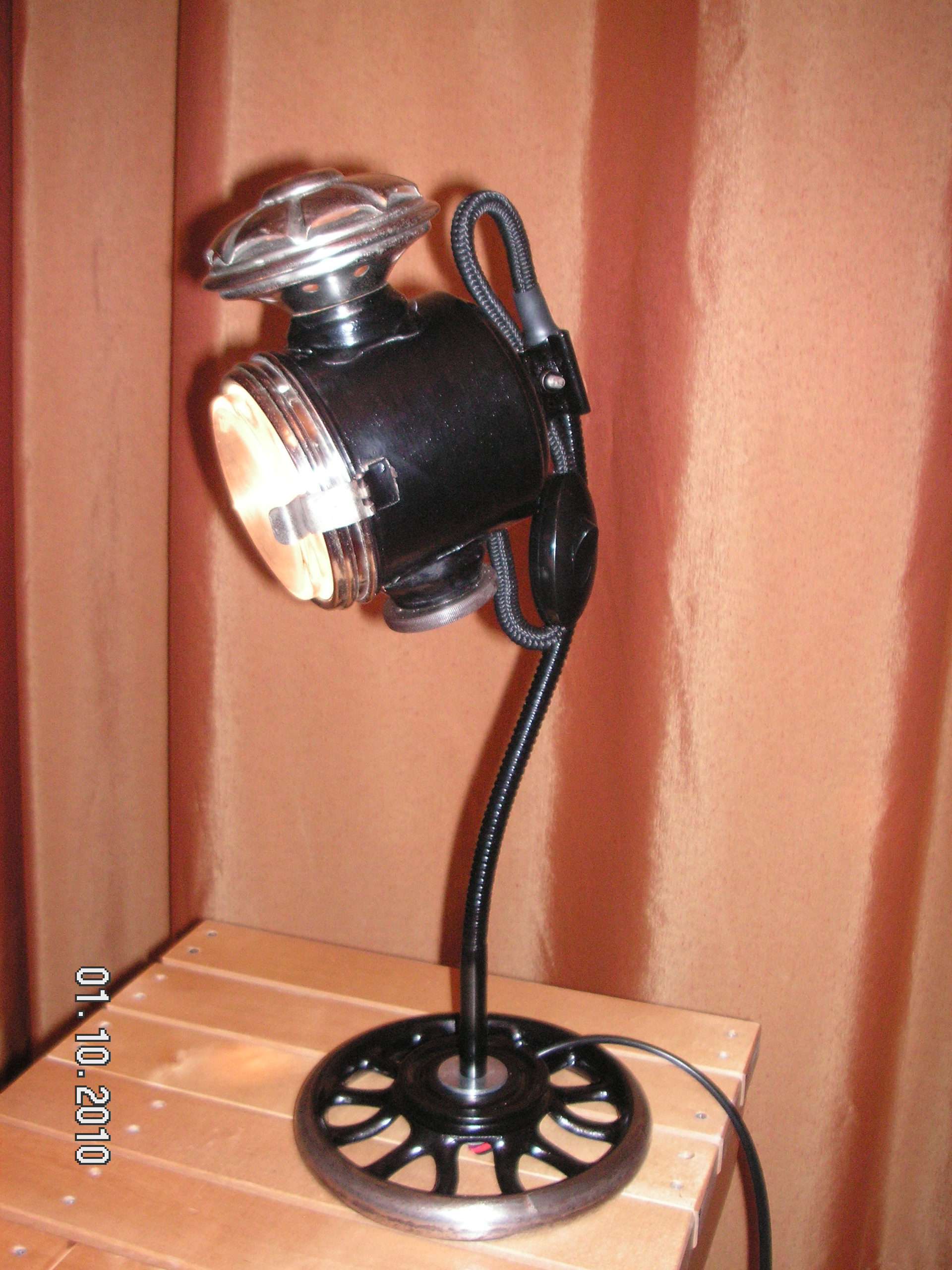 Я уже не помню, выкладывал или нет.... но на всякий случай вот еще одна настольная лампа. Это ацителеновый автомобильный фонарь начала ХХ века, Франция. Стекло заменено на современное, от противотуманки, провод пропущен в оплетку от веревки для пущей "винтажности". Основание - маховик от машинки "Зингер" того же периода, ножка - от донора (современной лампы). Внутри галогенка.