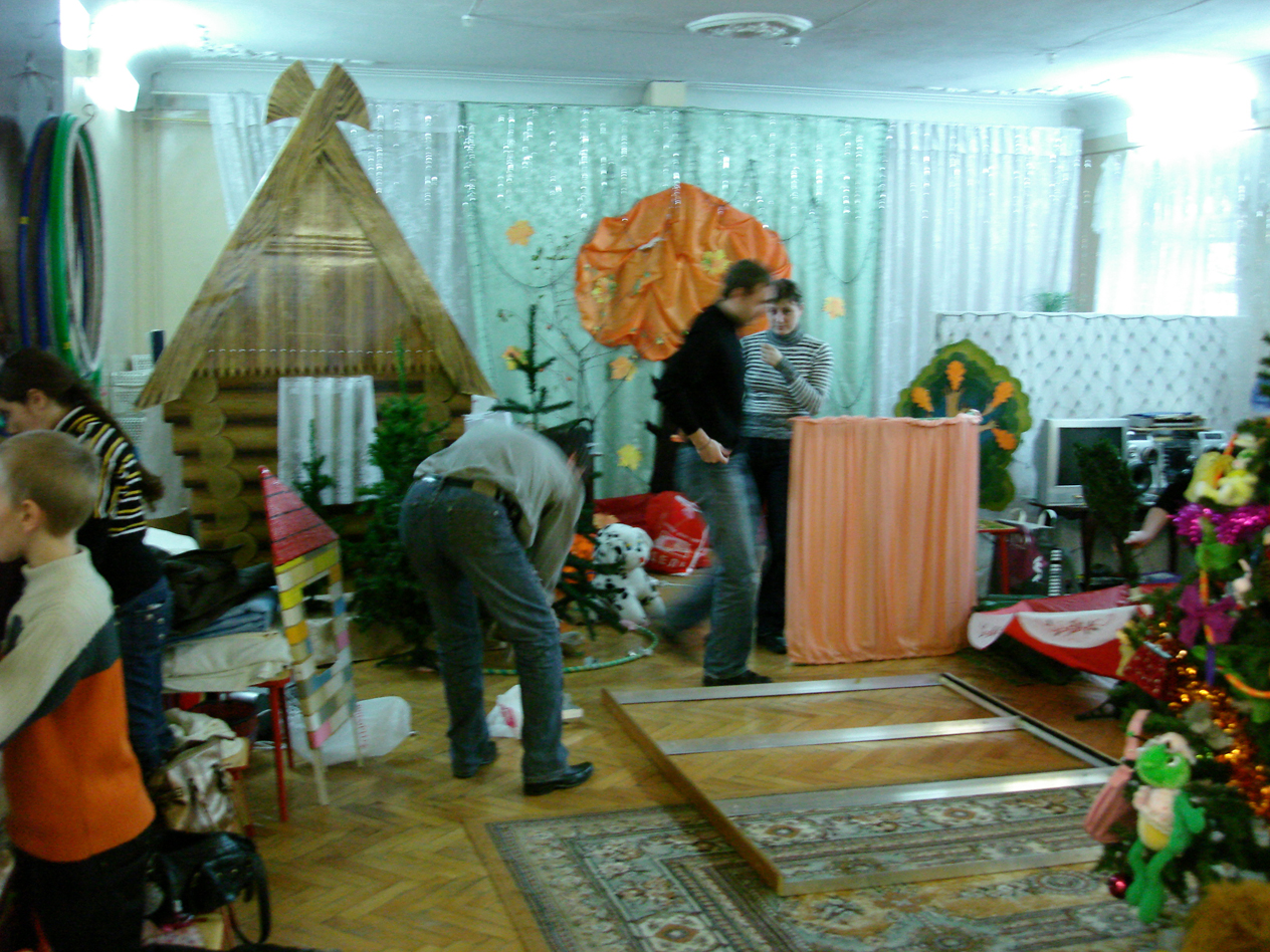Во время нашего прибытия в дд детишки обедали,поэтому нас не встречали.Артисты пошли переодеваться,мы стали собирать ширму и елку-снегопад.В зале была еще елка,но без игрушек :? и тут нам на помощь пришел мешок плюшевых зверей,переданный кем то из форумчан(Deller или Чертенка?)спасибо им.