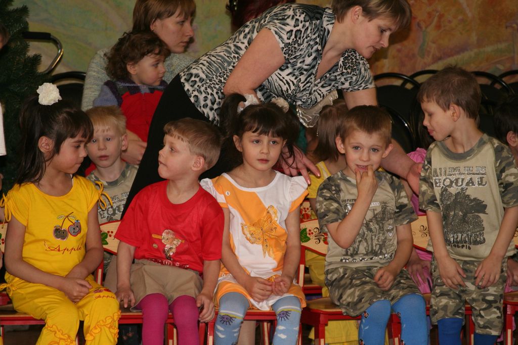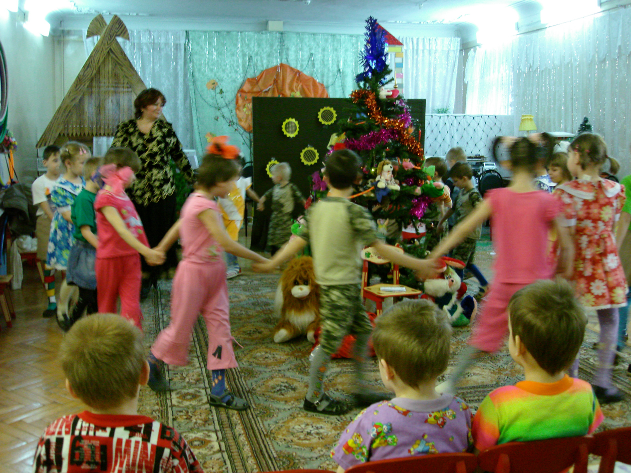 Детей заботливо(без криков и толканий) рассаживают по маленким стульчикам,самых малышей воспитатели берут на руки,и наконец все начинается!На сцену выходит ведущая,рассказывает про праздник новый год,ребята громко ей отвечают.Потом зовут клоунов,один из них был навязчиво-женского пола,и пошло веселье.Всех песенок и игр точно не помню,вроде был там еще какой-то олень,который кидал с детьми надувные мячи :D .