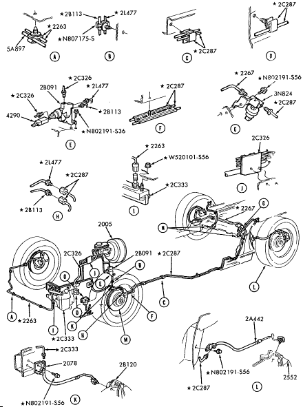 When the brake pedal (2455) is applied, the full rear brake fluid pressure passes through the brake pressure control valve to the rear brake system until the valve's split point is reached.