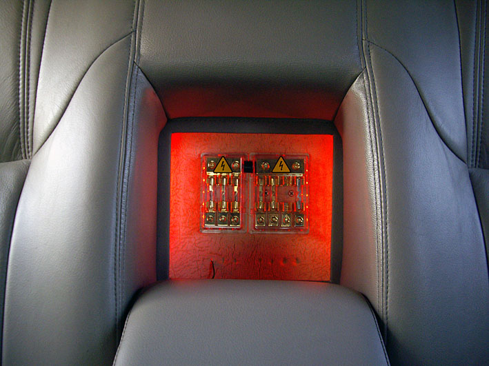 Использован 5 канальник из экономии места, что не очень гуд. Усь расположил в заднем крыле, на месте штатного уся с головкой и отлитым по внутренней форме крыла объемом - интересная штатная конструкция, все в одном блоке. Штатная головка, хотя и 8, но двухобмоточная, прошитая, выглядит достойно, правда без опознавательных знаков. Дверные динамики штатно были смотированы в пластиковых коробах, 5 на 7 или что-то вроде этого. Их пришлось выкинуть и немного повозившись поставить на перед 16, на зад 13. Твитера поставил на торпеду в лобовуху. Работают на отражении. Кросы - в торпеде. Разнесенка на задних дверях ненужна, но у меня просто было. Динамики, твитеры, кросы - все в задних дверях. Ченжер идеально встал в карман с крышкой в левой части багажника. TV тюнер никуда не влезал, пришлось запихнуть под обшивку заднего левого крыла. Кларионовскую ТВ антенну поставить не удалось из-за размеров, поставил клеющуюся Alpine. Шумка в дверях - STP (иначе гудят и дребезжат по страшному). Позже пришлось и крышу проклеить - гудит. Корпусной саб встал в натяг за третьим рядом сидений. Подключен на бананах, поэтому если надо место - вынимаешь его и оставляешь в гараже. По-поводу ТВ тюнера - лишний геморой. На ходу картинка скачет, а если стоишь, то надо еще машину покатать туда - сюда. Типа как на маленьком телевизоре усы крутишь, а здесь всю машину. Наилучший прием обеспечивают четыре рога на крыше плюс диполь, но надо крышу дырявить, проводка ... куча кабелей.. короче неохота возиться. Апарат 1 дин, в свободное место засунули пластиковый карман от девятки. Немного подделали и получилась полка для пультов и прочей мелочи. Музыка и DVD очень неплохо, ТВ - так себе. Все управляется с тач-скрина по сенету - очень удобно, просто жмешь пальцем на выпадающие меню - класс! Можно еще камеру заднего вида воткнуть, но тоже вещь в себе, у меня на другой машине штатно стоит, покрывается грязью быстрее чем стекло, ни черта на видно!