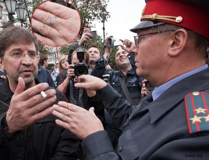 На фото Юра Шевчук (тот что музыкант) и начальник Управления информации и общественных связей ГУВД по г. Москве полковник милиции В. Бирюков. Татуировка на пальце у гражданина начальника имеет свой смысл. Такие татуировки наносили на себя осужденные по статье 144 Уголовного кодекса РСФСР (Тайное хищение чужого имущества) т.е. кража. Наказание в виде лишения свободы на срок до трех лет, или исправительными работами на срок до двух лет, или штрафом до пятидесяти минимальных размеров оплаты труда.