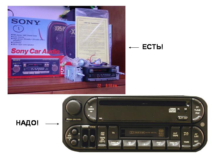 А НАФИГА ЕЕ ИСКАТЬ? Желающие поставить старую балалайку в винтажное авто будут ставить РОДНУЮ, на которой написано Ford, GM, Pontiac и тд. Нафига Sony ставить?ALEXXX#1 писал(а):Не спорю. Может и не так назвал. Но все ж таки 18 лет игрушке.