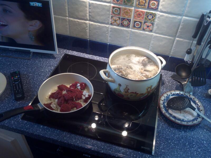 Тем временем шинкуем лук и прожариваем с томатом, его надо много-это острый суп.