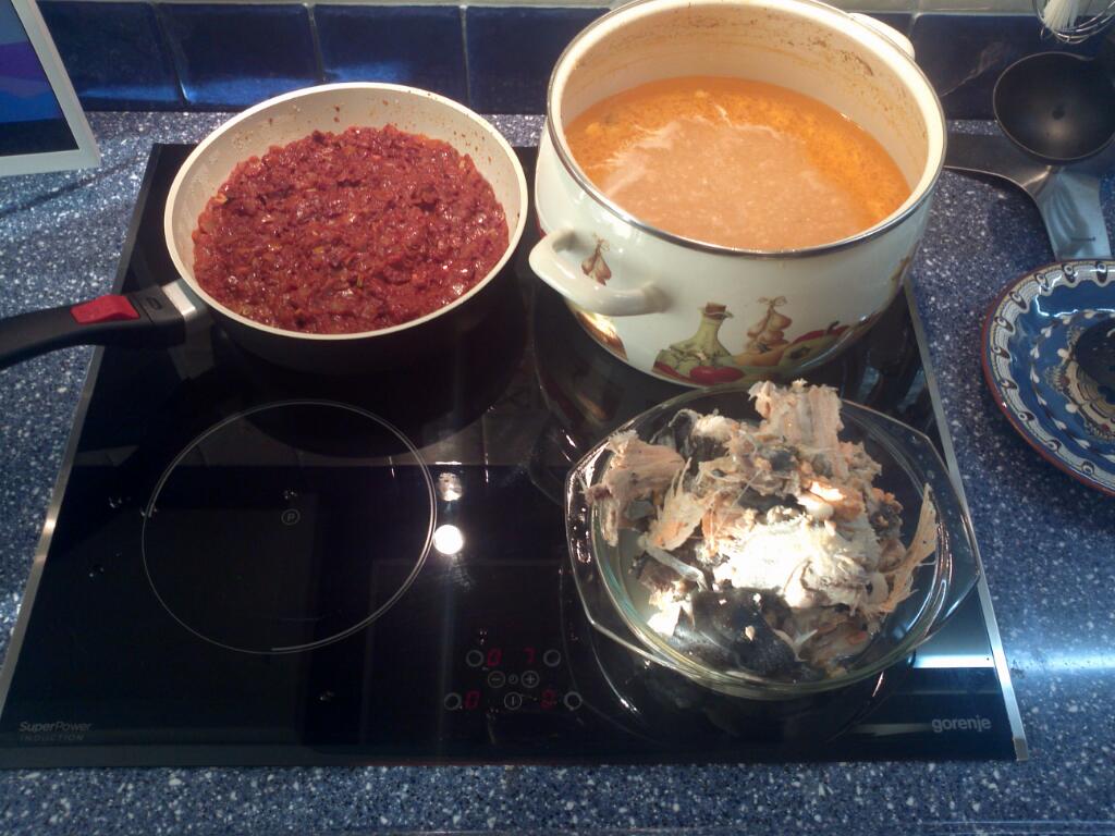 Закладываем всю рыбу в суп, доводим до кипения аккуратненько, суп очень густой, может пригореть.